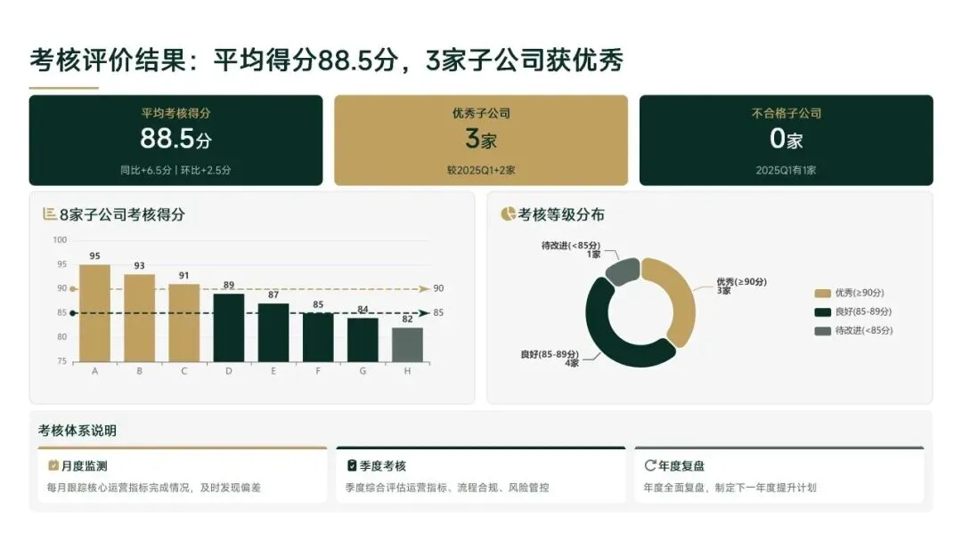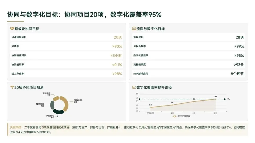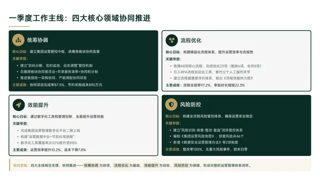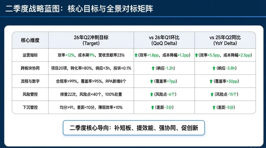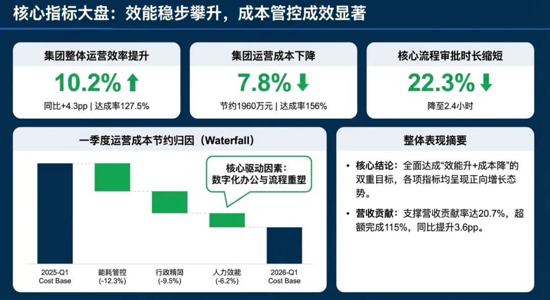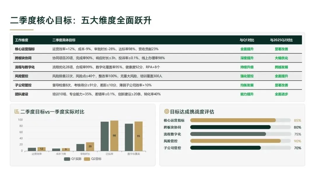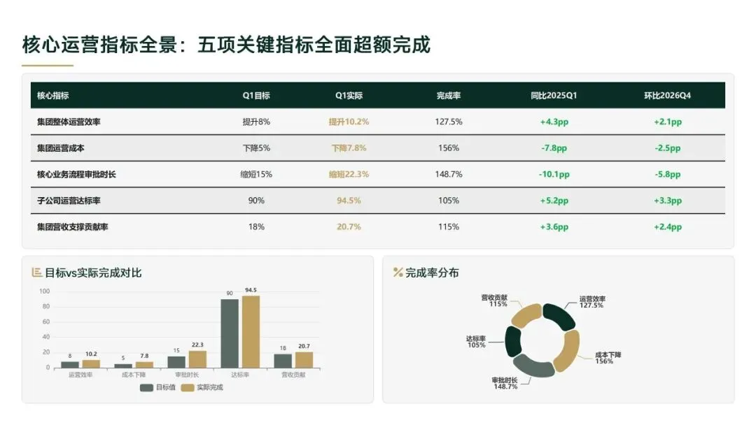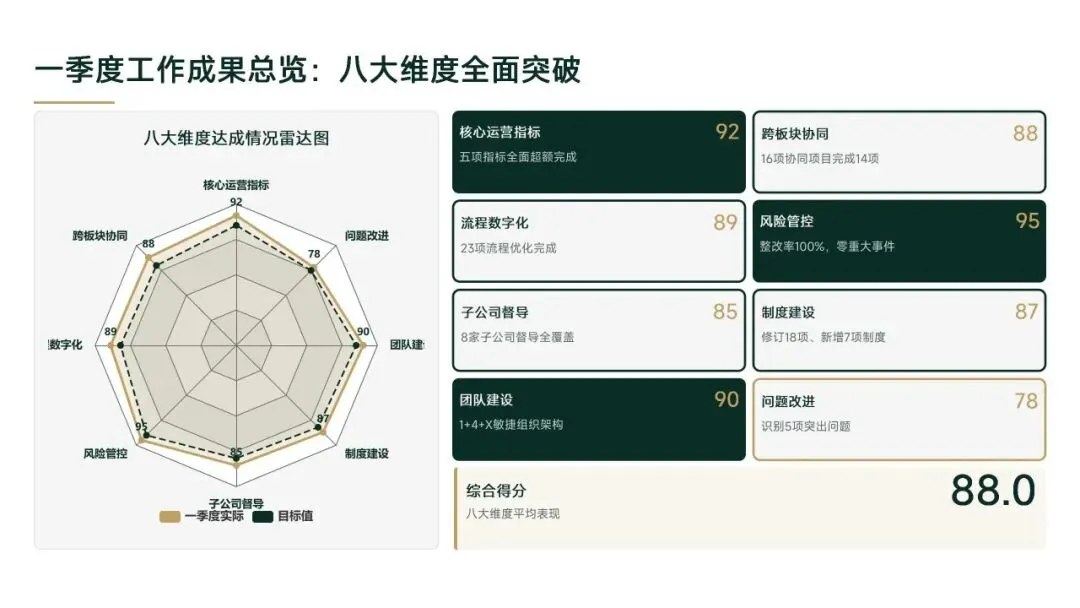 2026年一季度集团运营管理部围绕战略落地、效能提升等四大主线推进工作,核心指标全面超额完成,八大维度平均得分88.0,但也暴露5项突出问题;二季度以“补短板、提效能、强协同、促创新”为核心,设定六大维度跃升目标,推出八大落地举措并搭建四维保障体系,推动运营管理精细化、数字化升级。