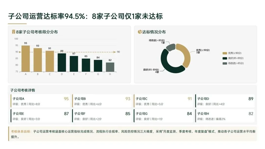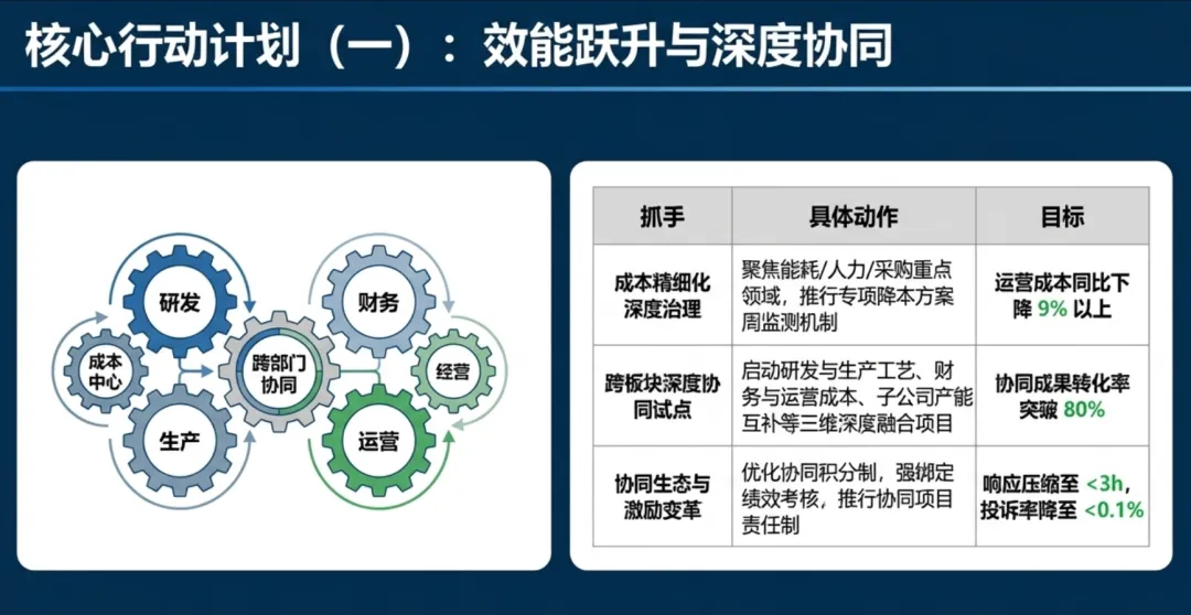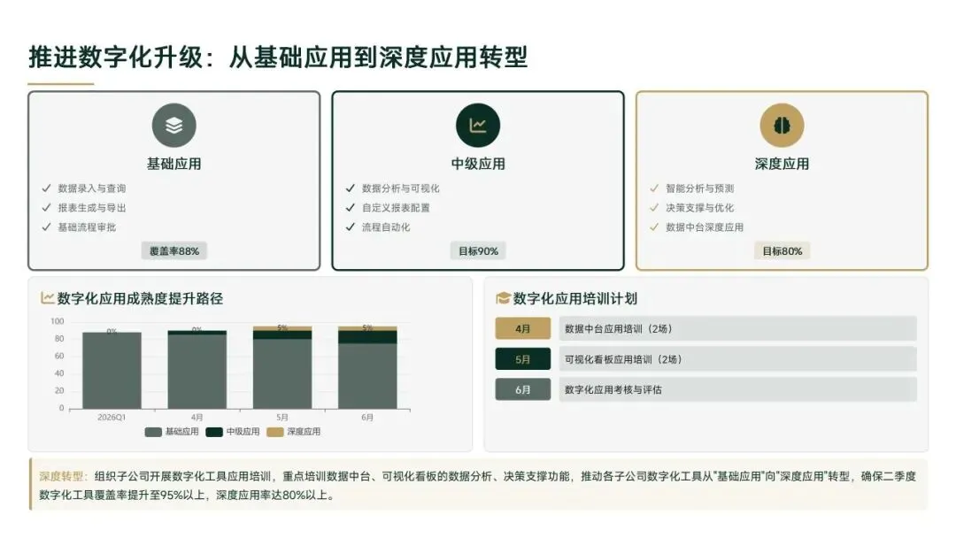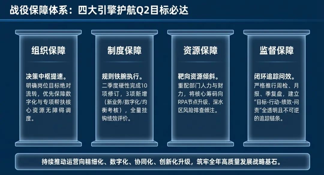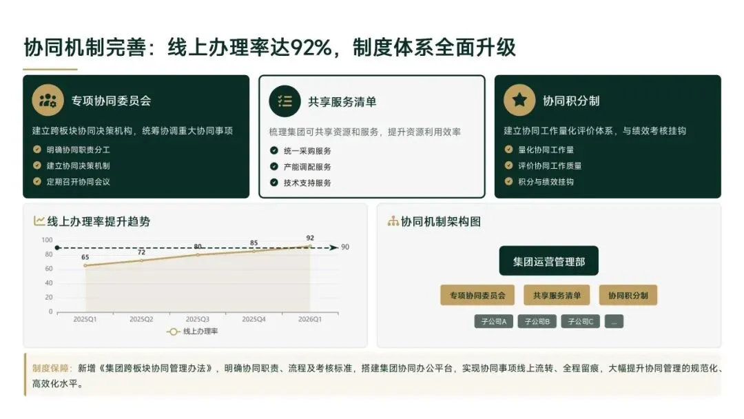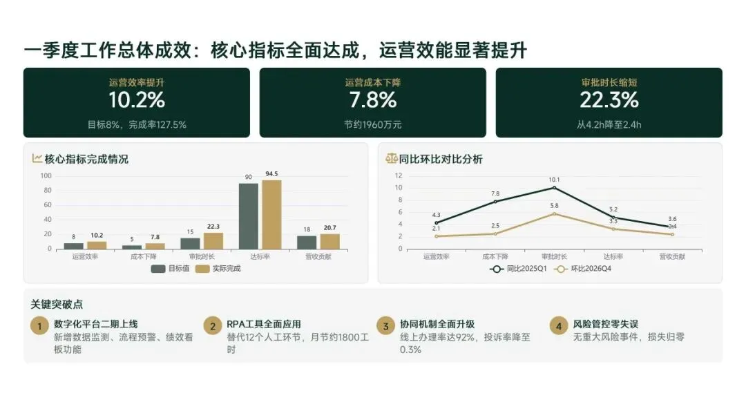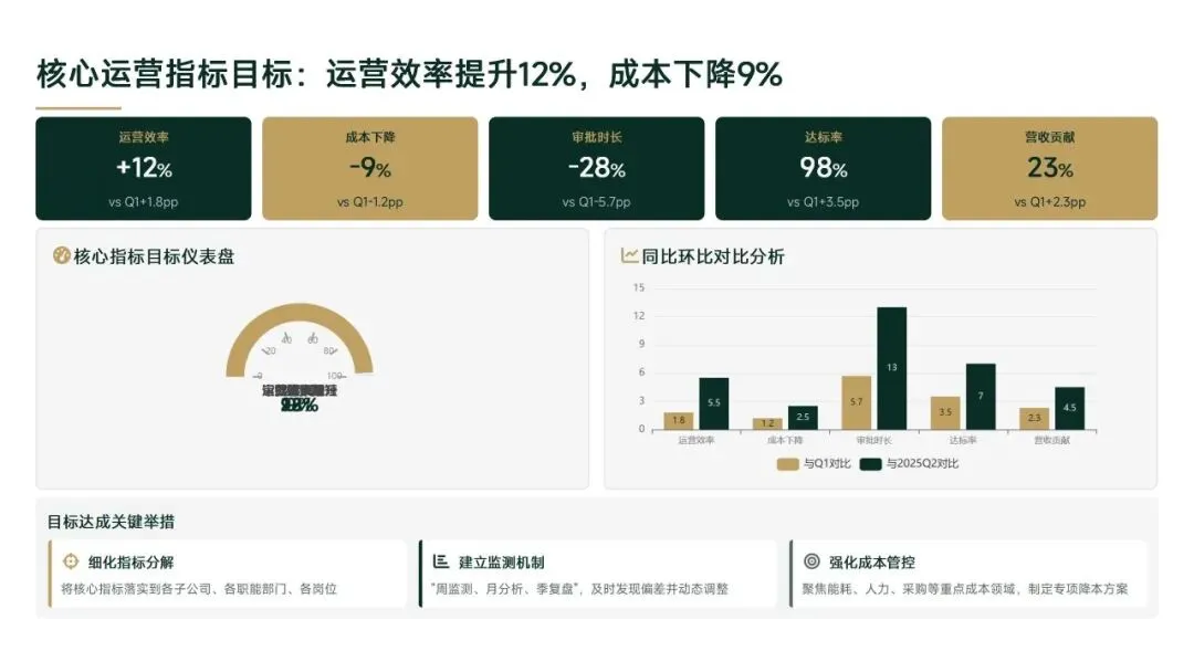 2026年一季度集团运营管理部围绕战略落地、效能提升等四大主线推进工作,核心指标全面超额完成,八大维度平均得分88.0,但也暴露5项突出问题;二季度以“补短板、提效能、强协同、促创新”为核心,设定六大维度跃升目标,推出八大落地举措并搭建四维保障体系,推动运营管理精细化、数字化升级。