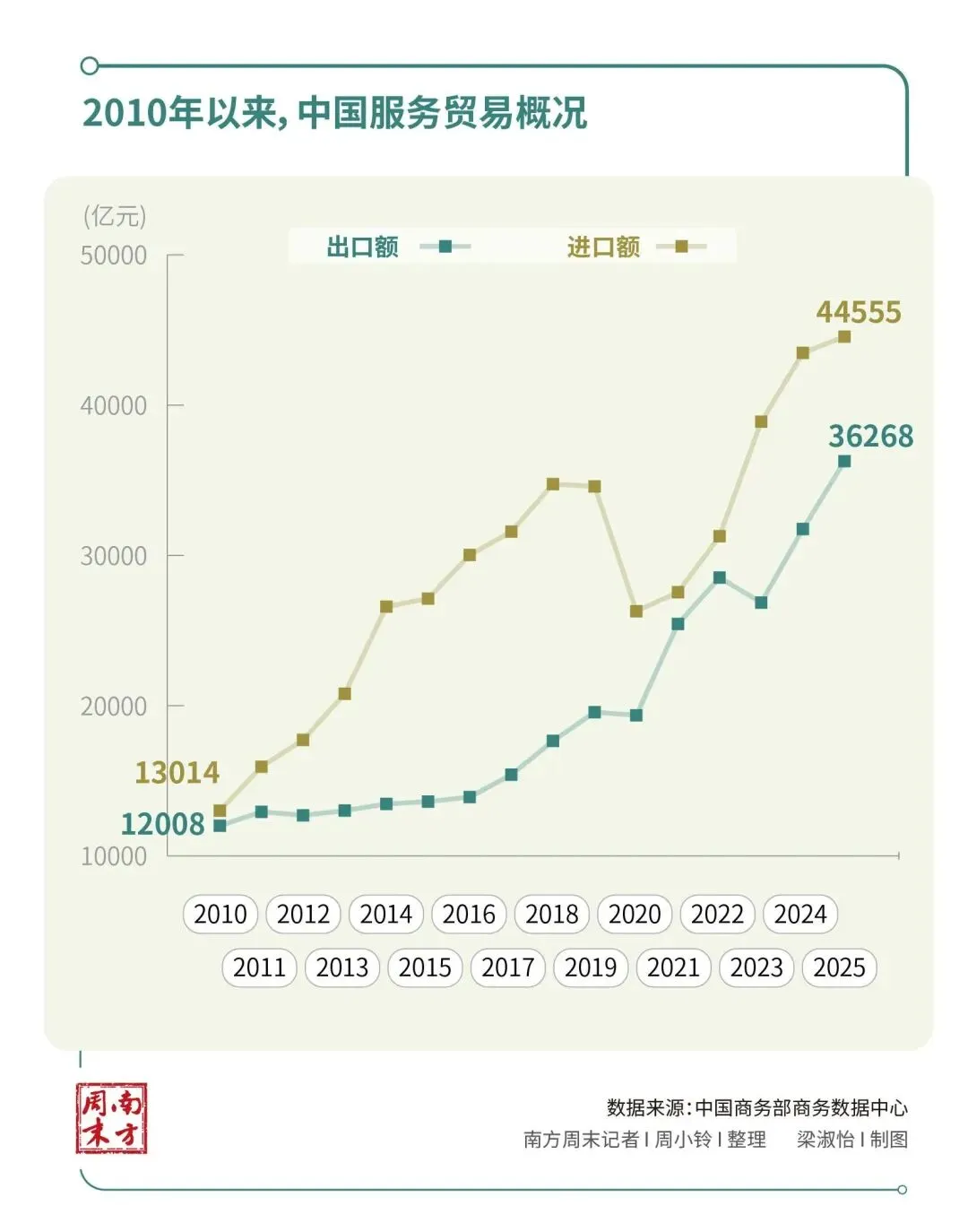 中国是货物贸易大国,2025年货物贸易总额达到45.47万亿元,服务贸易总额仅为8.08万亿元。