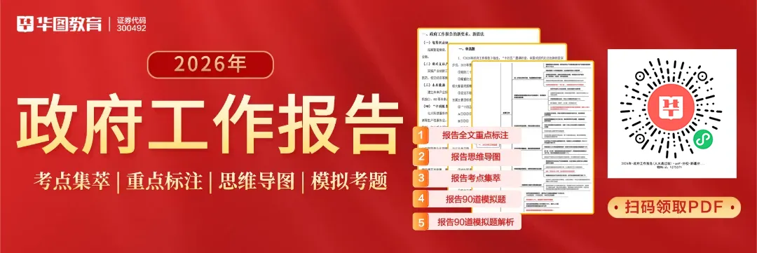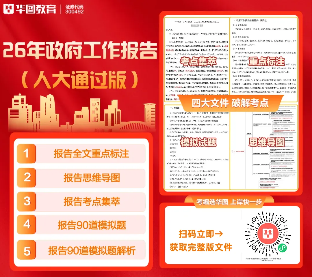 政府工作报告(人大通过版)的资料来了!【两会考点完整版】重大会议新考点是咱们考公考编人最需要关注的!华图教研老师根据今年政府工作报告,整理了全文重点标注、考点集萃、思维导图、90道模拟试题,一起来看~2026年考公考编必看,转发➕收藏本文,速速转给你身边需要的人!