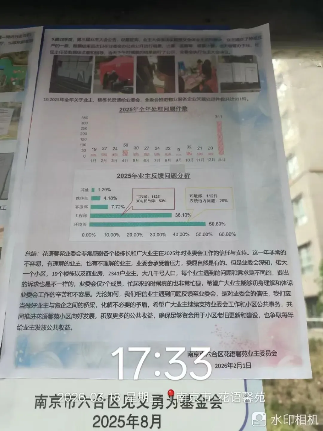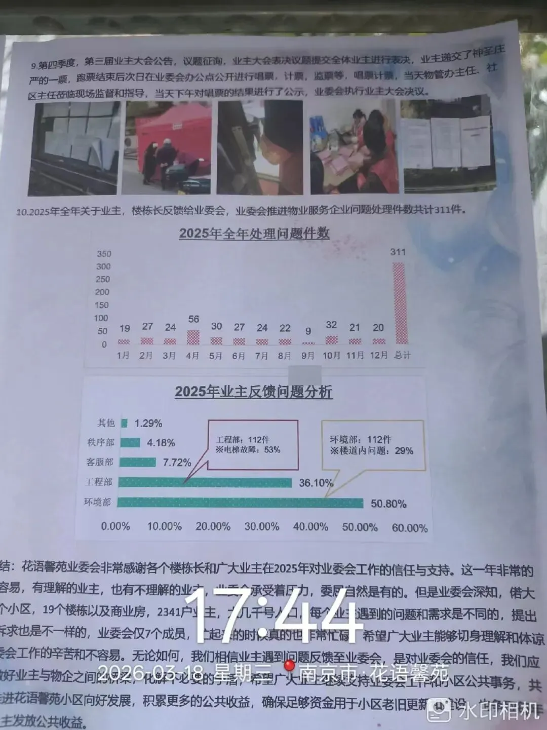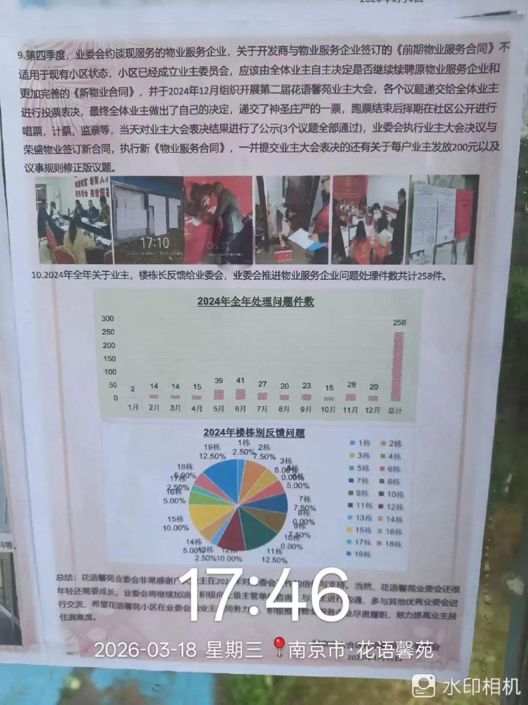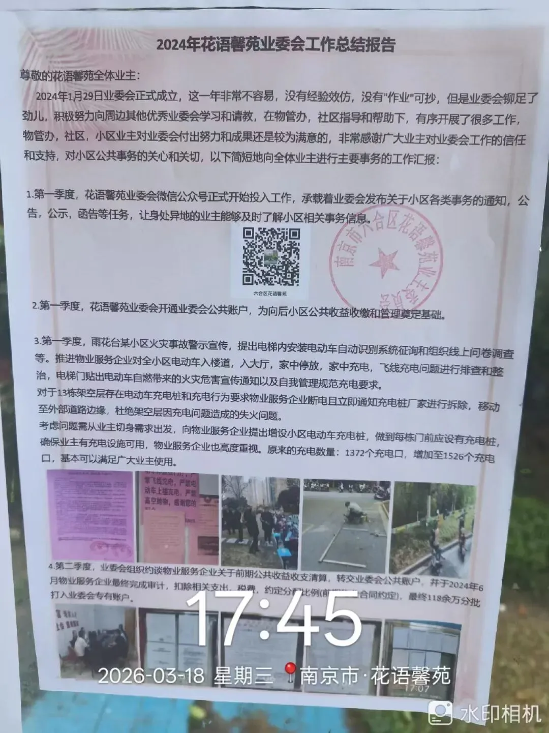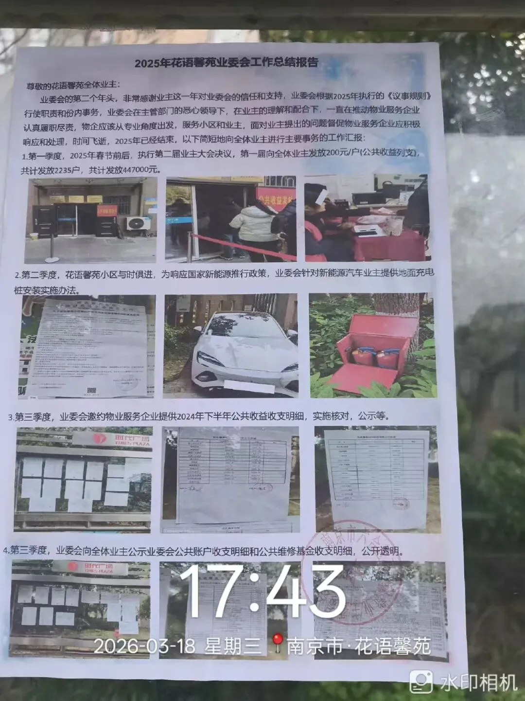 非常感谢广大业主和楼栋长给予对业委会工作的信任与支持。这两年非常的不容易,有理解的业主,也有个别不理解的业主,业委会承受着压力,委屈自然是有的。但是业委会深知,偌大一个小区,19个楼栋以及商业房,2341户业主,大几千号人口,每位业主遇到的问题和需求是不同的,提出的诉求也是不一样的,业委会仅7个成员,各自也有自己的工作和家庭需要忙碌,小区公共事务忙起来的时候真的也非常繁忙,业委会也在不断学习和不断完善,希望广大业主能够切身理解和体谅业委会工作的辛苦和不容易。 无论如何,我们始终相信业主遇到问题反馈至业委会,是业主遇到了真实困难,也是对业委会的信任,我们应当做好业主与物企之间的桥梁,努力化解彼此的误会和予盾,建立相互信任和相互帮扶的良好关系,希望广大业主继续支持业委会工作和小区公共事务,与业委会一道督促物业服务企业,共同推进花语馨苑小区向好发展,克服和解决现有实际困难,积累更多的公共收益,守住业主的钱袋子,努力确保足够资金用于小区老旧更新和建设,也争取每年能够开展发放业主公共收益,提高业主满意度和归属感,再次感谢花语馨苑全体业主的信任与支持。