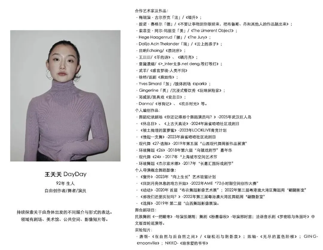 持续探索关于由身体出发的不同媒介与形式的表达。个人作品:《你还记得那个舞蹈演员吗?》、《上古天真论》、《休息日》、《慢起一支舞》、年龄三部曲等……