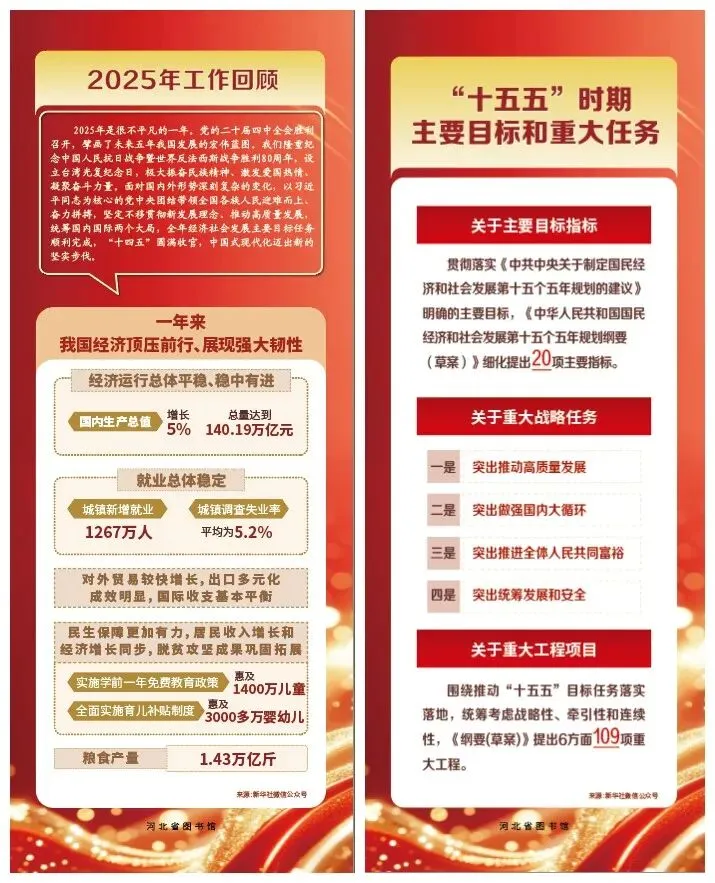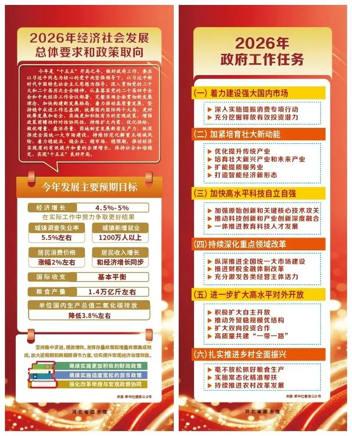 为深入学习贯彻2026年全国两会精神,助力广大读者全面准确领会2026年政府工作报告核心要义,河北省图书馆于2026年3月17日在一楼阳光大厅推出“2026年政府工作报告”宣传展。展览采取线上线下同步展出的方式。