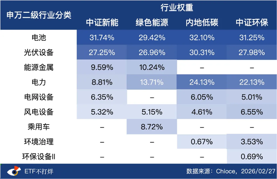 比如绿色能源指数明显更集中在新能源发电和电池板块,并不包含电网设备;而内地低碳和中证环保这两只指数,则会覆盖环境治理相关领域,而不包含上游能源金属。