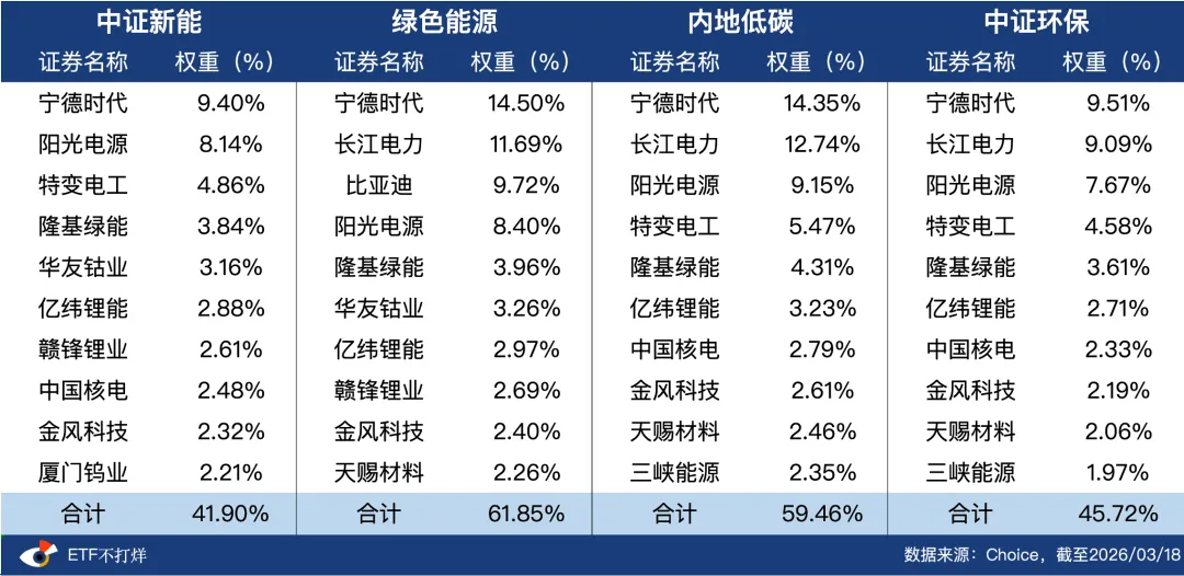 所以核心差异其实在权重分布上,绿色能源和内地低碳这两只指数的头部集中度会更高,前十大成分股合计占比都在60%左右;另外两只指数则不足50%。