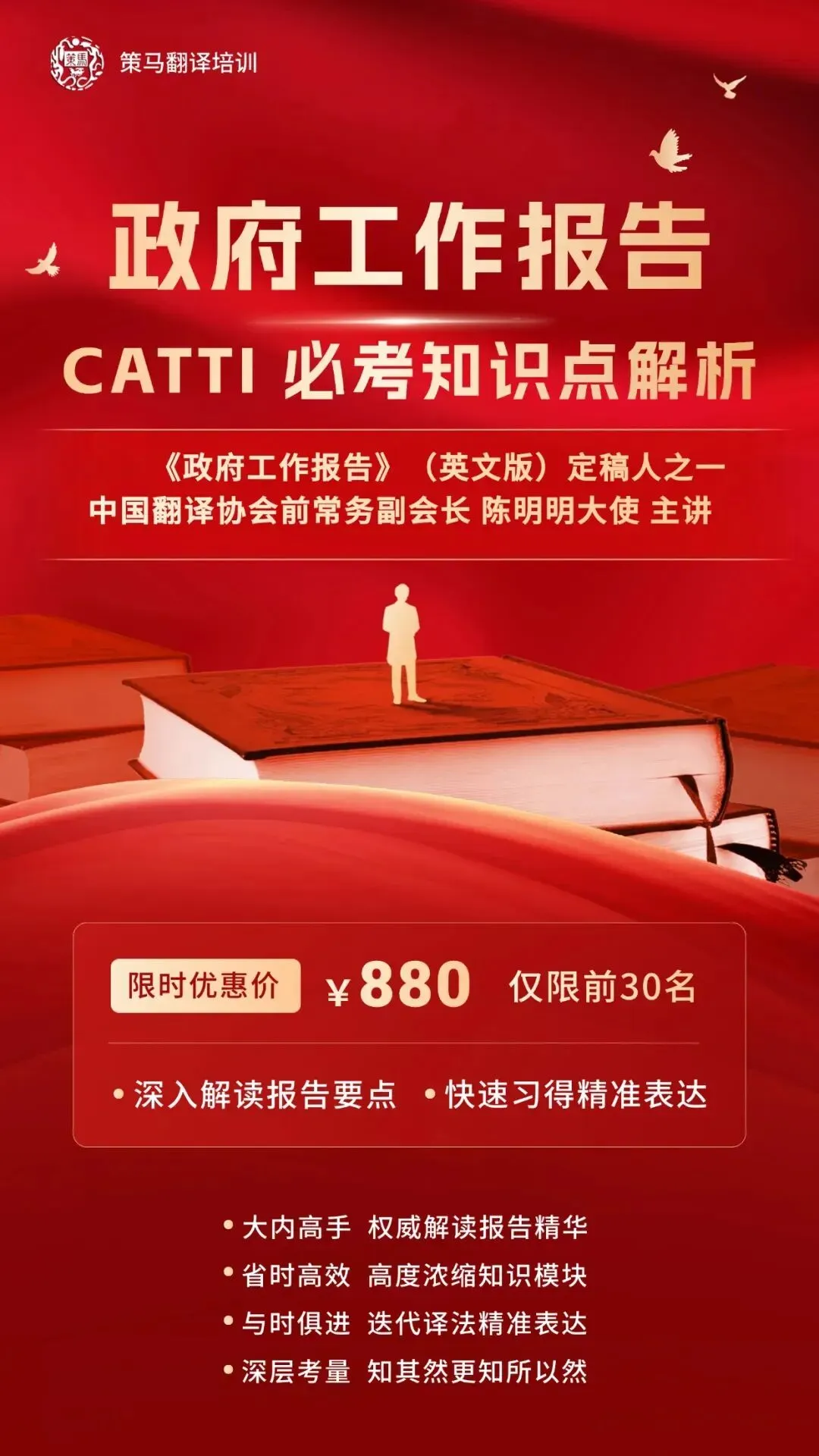 随着中国改革开放的日渐扩大,中外交流与合作日益增多,国际社会希望尽可能全面、准确、详尽地了解中国,一年一度的《政府工作报告》发挥着日益重要的作用:对内,它是国家的施政纲领;对外,它是国际社会了解我国国情的第一窗口,也是对外宣传我国路线方针政策的重要途径。《政府工作报告》的翻译无疑是一项任重而道远的工作,这不仅需要译者具备良好的中英文表达能力、扎实的语言功底、娴熟的翻译技巧,还需在国家利益、政治立场等问题上拥有颇深的素养。一些政策新词和中国特色化词语的翻译,往往不能在汉英字典里找到与之对应的现成译法,而是要求译者根据词语内涵和政策内容精心地从英语语言中找出与之对应的表达,并作为官方译文固定下来。因其翻译的好坏关乎到中国的国际声誉和国际印象,差之毫厘便会误导他国对我国的看法,所以政府工作报告的英译版体现着特殊的文体风格。《政府工作报告》(英文版)是对译者英文功底、翻译技能、翻译策略、时政涵养的全能型考验,其“技术含量”非比寻常,堪称中国翻译“国家队”的集大成之作。正因为如此,《政府工作报告》(英文版)成为了中国几乎所有英语爱好者的必读书。中国翻译协会前副会长、2026《政府工作报告》(英文版)定稿人之一、外交部翻译室前主任陈明明大使,为策马学员深入解读《政府工作报告》(英文版)的一应要点,快速习得中国特色词汇的精准表达。◈ 授课形式