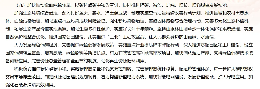 政府工作报告在第四大项“2026年政府工作任务”第九小项中,以近500字的篇幅系统部署了“加快推动全面绿色转型”。报告明确提出:以碳达峰碳中和为牵引,协同推进降碳、减污、扩绿、增长。