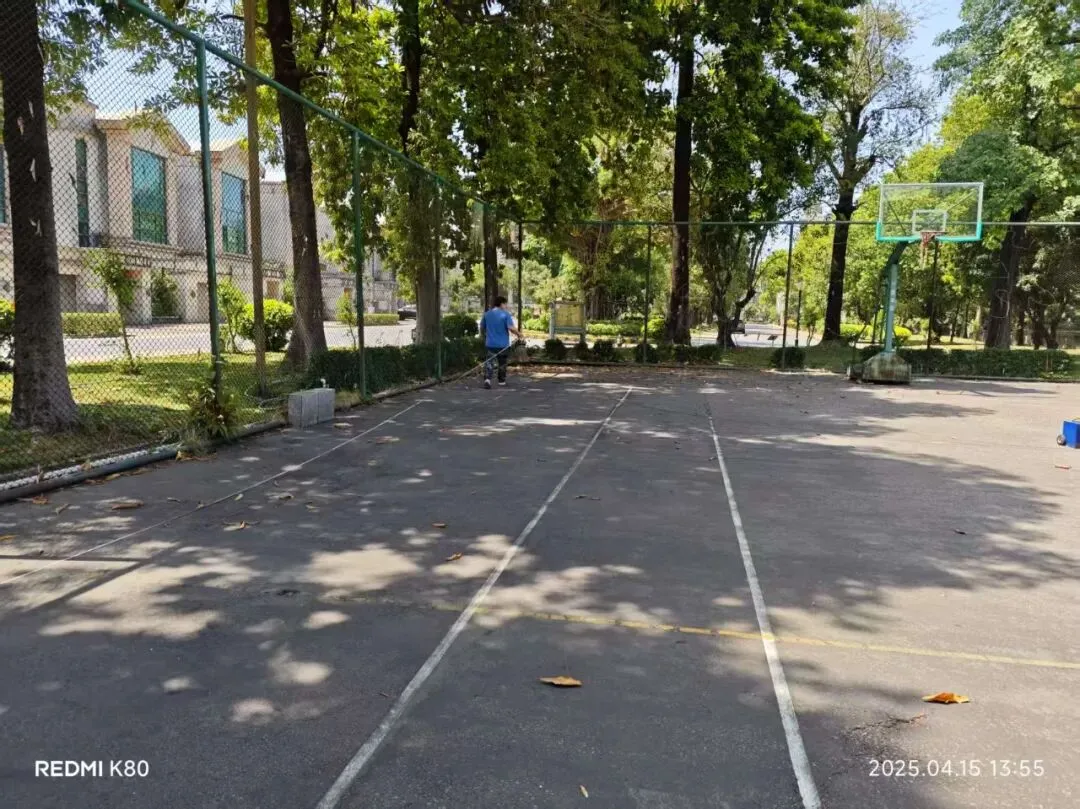 B、篮球场现场测量尺寸,查看要维修的项目,地面有窿起的地方要处理,排水、围网、照明等,施工方回去重新设计方案。