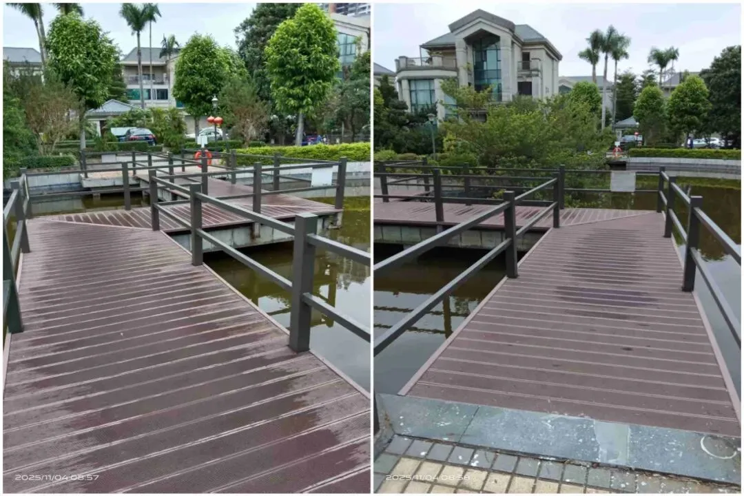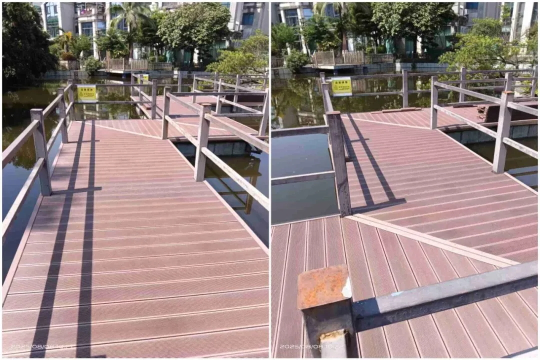 2025年11月2日,中心湖原木桥已完成改造,更换成塑木板,现已恢复通行。