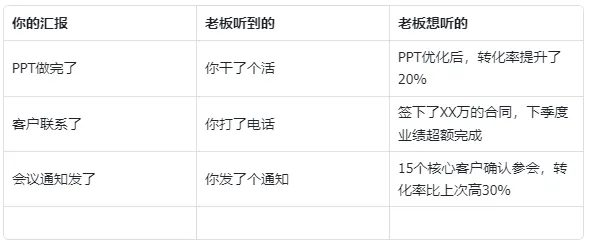 汇报的核心,不是告诉老板你做了什么,而是让他看见你创造了什么价值。