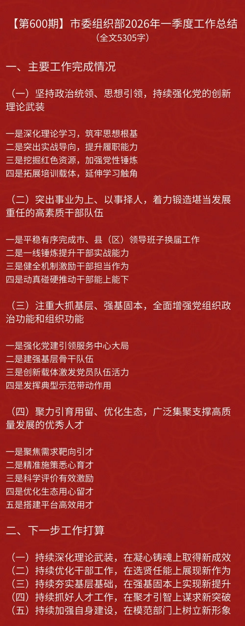 今天推荐一篇《市委组织部2026年一季度工作总结》,全文5305字。文章从结构上看,开篇凝练主题,主体以“四大板块”系统铺陈,结尾“五大计划”呼应升华,形成“目标-举措-成效-展望”的完整闭环;从技法上看,善用数据量化成果、巧借案例增强说服力、活用排比强化气势;从内容上看,既突出“选育管用”干部链条的完整性,又注重“党建引领+人才赋能”的协同性,更彰显“问题导向-目标导向-结果导向”的闭环思维,具有较强的借鉴价值。全文