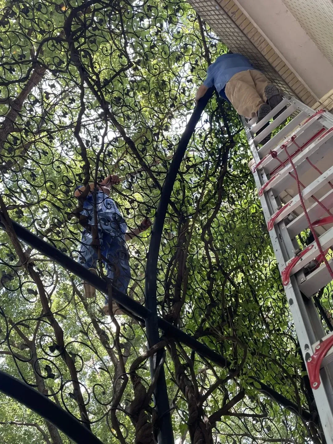 十是配电房旁巨型紫藤架维修问题。紫藤架周长30米,高达6米,年久老化,22根金属支撑柱根部锈断,网架锈迹斑斑。商请露香园工地重建根部支撑,街道赞助防锈油漆等材料,物业师傅与业委一起,8次利用周末时间,登高涂刷铁锈转换油漆。同时清理了杂乱藤蔓和屋顶野生灌木,清理被藤蔓裹住的树木断枝。