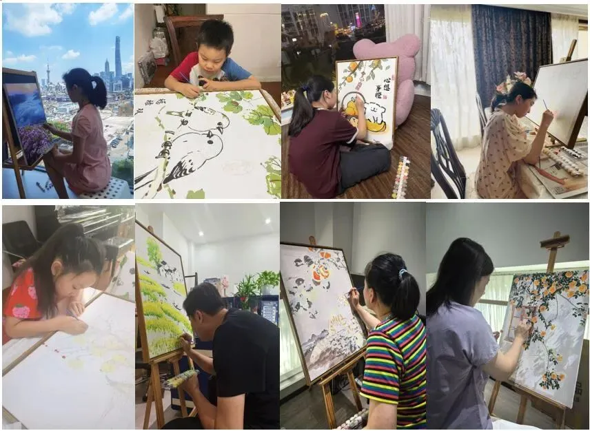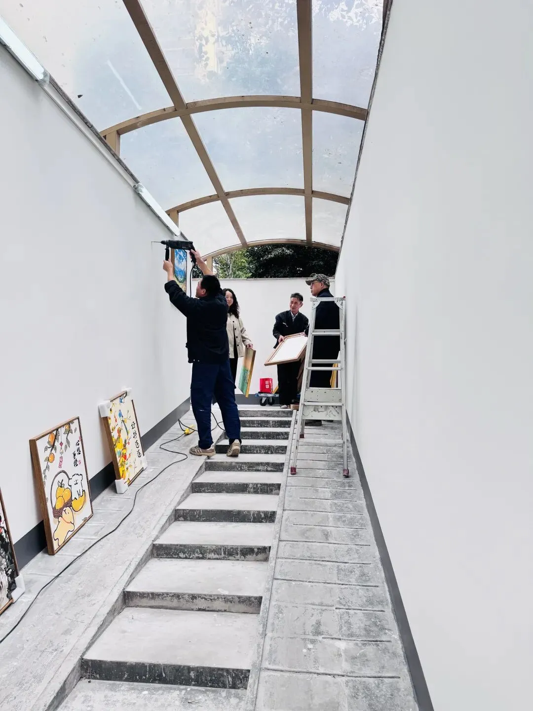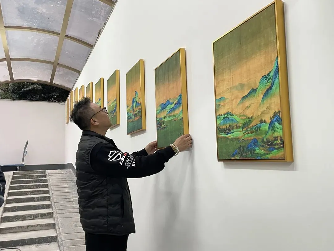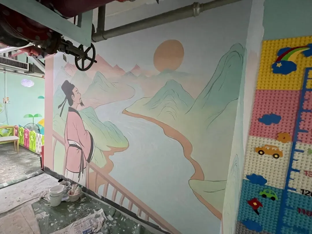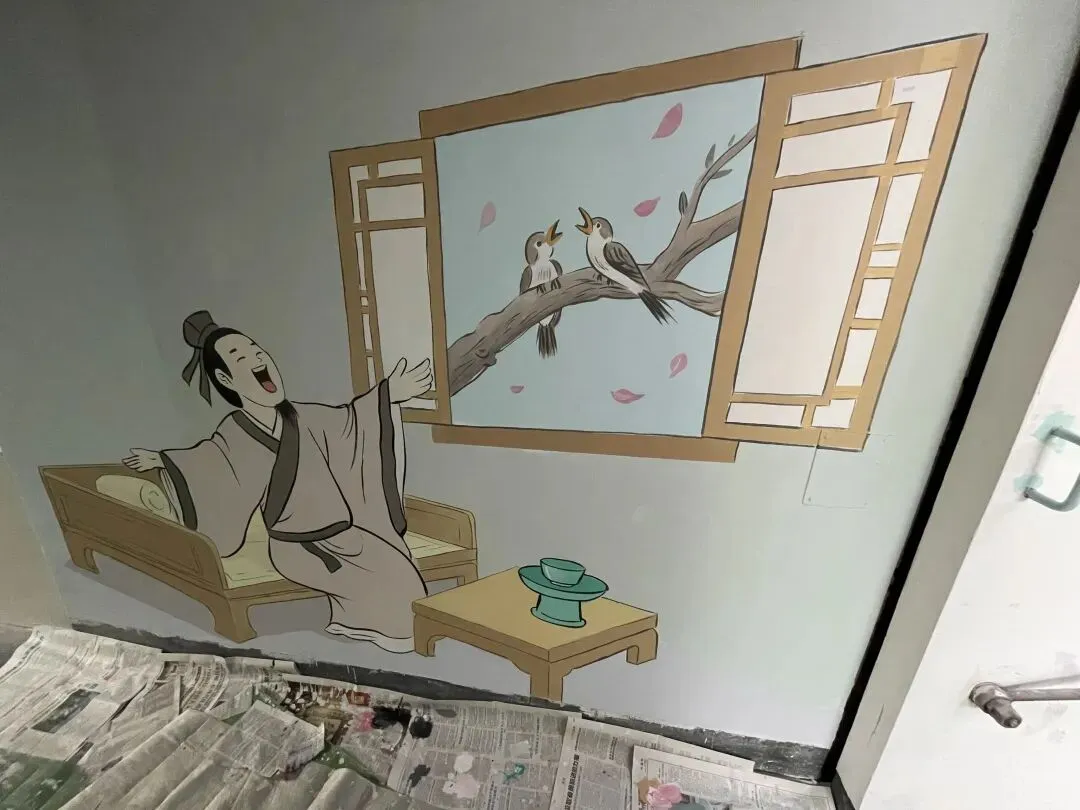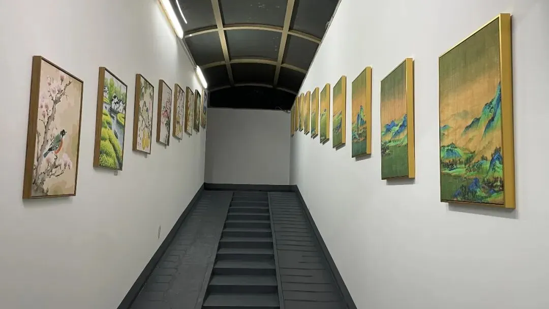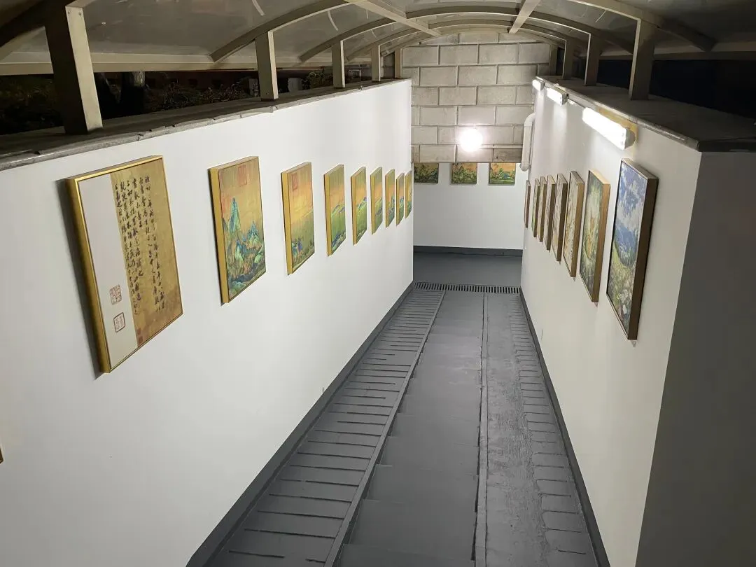 二是“国风长廊”。选择五号楼下方自行车库到地面的人行阶梯式通道试点。铲除墙面,重做墙面和户外涂料粉刷,地面涂刷环氧地坪油漆,金属管道涂刷防锈油漆,改造灯光照明,“打针”墙内堵漏,更换落水管道。在居委会帮助下,邀请居民区居民创作数字绘画。绘画人员包括太阳都市居民区的少儿、居民、社工、警察、赞助商泰隆银行干部员工、科瑞物业公司员工。其中年龄最小者为2名7岁学生。最终通道一侧为16幅居民数字绘画,一侧为青绿山水《千里江山图》16幅分解图。