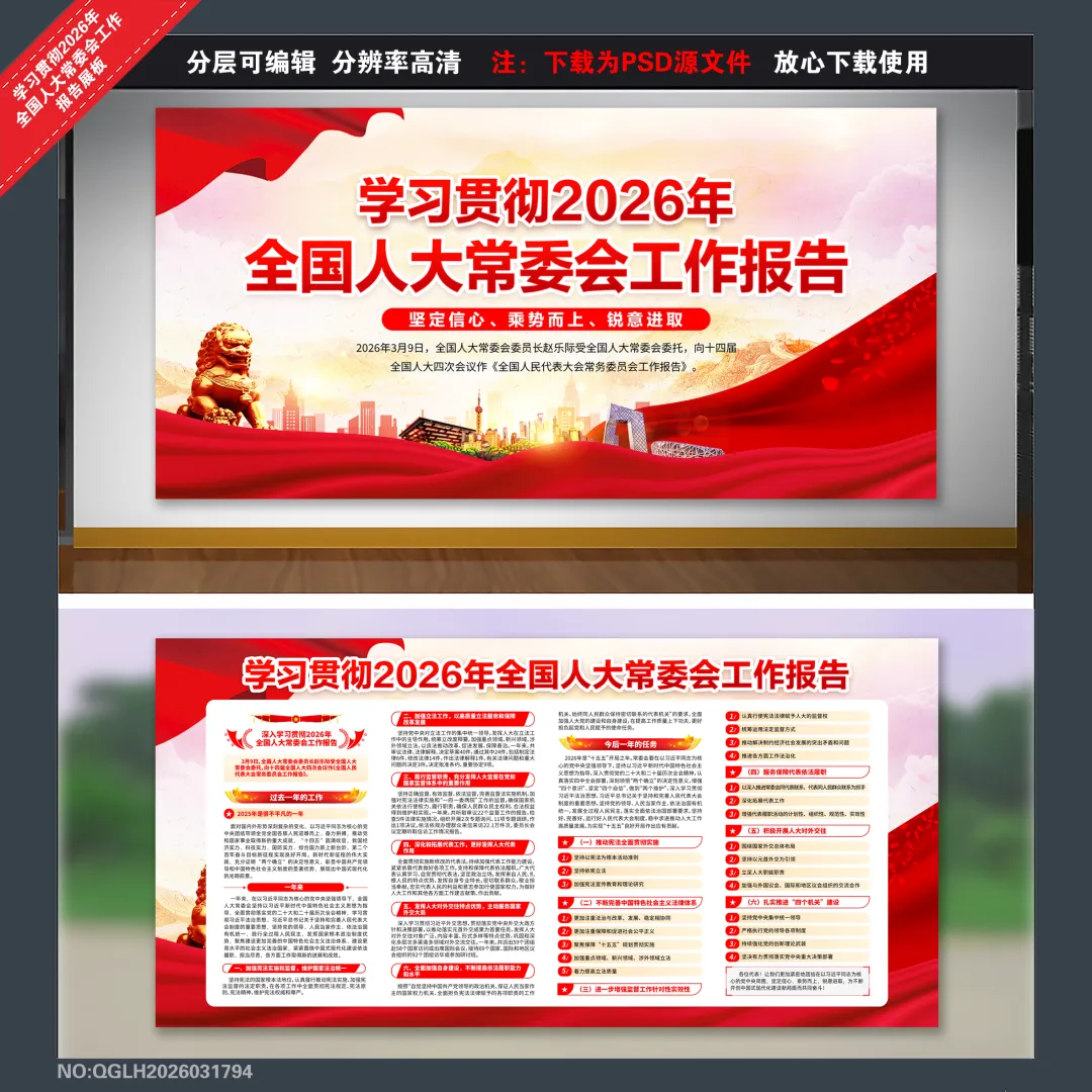 >学习贯彻2026年全国人大常委会工作报告海报展板PSD源文件