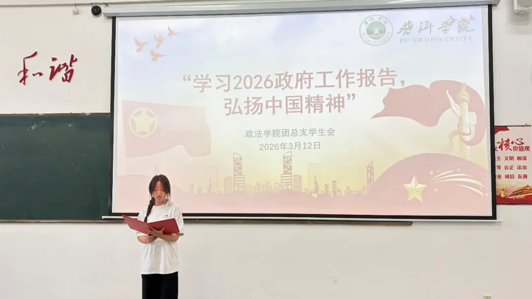 为深入学习贯彻2026年中央人民政府工作报告精神,引导团员青年准确把握国家发展大局和“十五五”规划方向,同时通过奋进“十五五”主题短片《中国精神》感悟民族精神力量,激励广大团员坚定理想信念,增强使命担当,以昂扬姿态投身强国建设、民族复兴伟业。政法学院团总支于2026年3月12日敏学楼215组织开展以“学习政府工作报告,弘扬中国精神”为主题的团学活动。本次活动由刘彤彤同学主持,各班团支书、政法学院青马班(第三期)、学生会全体成员参加本次活动。