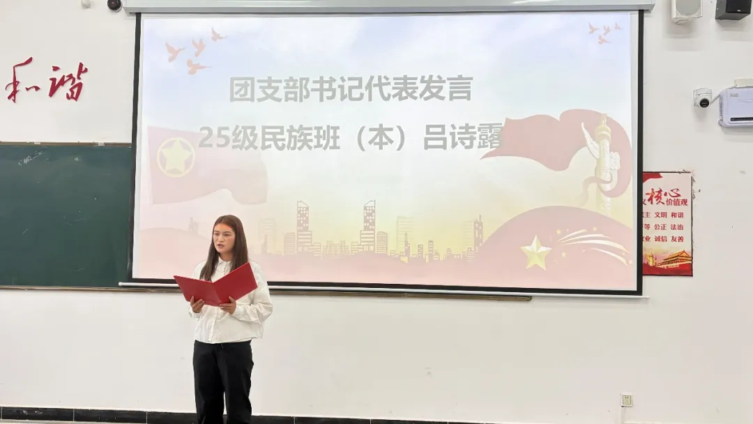 活动中,来自25级民族班的团支部书记代表吕诗露同学结合政府工作报告和民族学专业的学习和思考,号召同学们将个人成长融入国家发展大局,为祖国建设贡献青春力量。