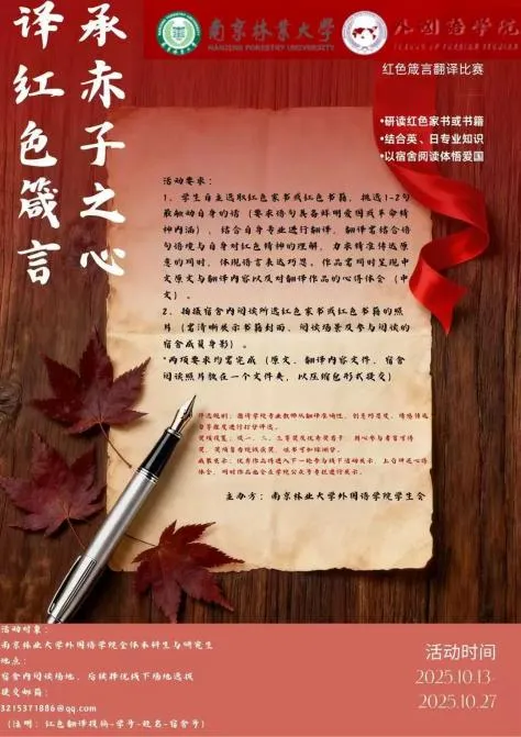 10月,推出“译红色箴言,承赤子之心”红色文化翻译活动,结合外语专业特色,让学子在红色经典翻译中深化对红色文化的理解与传播。