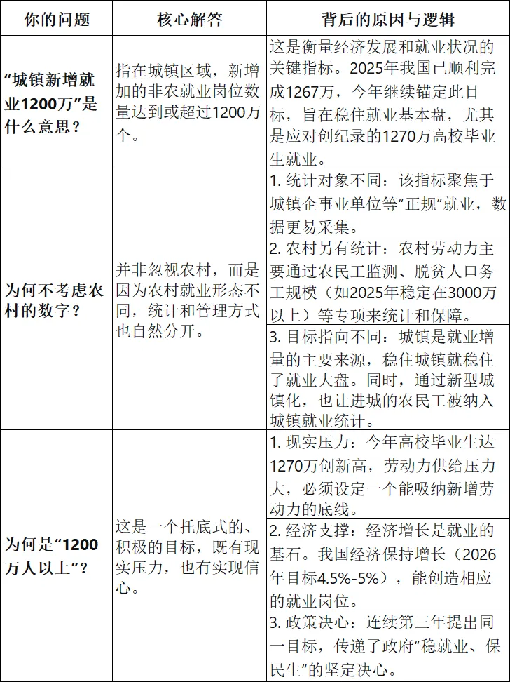 4.城镇新增就业1200万人以上:去年也是这个数字。这里我们需要搞清楚为何是1200万这个数字,也要搞清楚为何是城镇新增就业而不包括农村的数据。我们用表格来解答。
