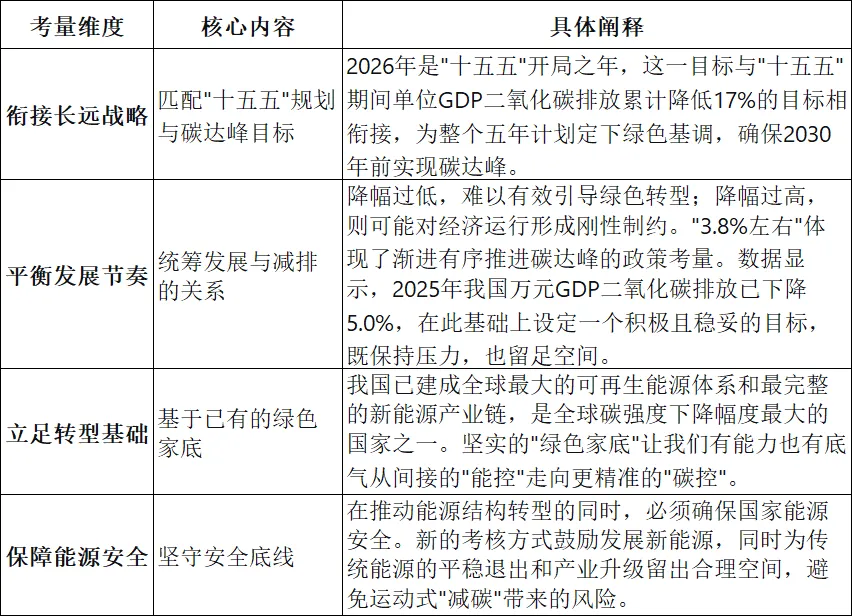 9.单位国内生产总值二氧化碳排放降低3.8%左右:去年的表述是单位国内生产总值能耗降低3%左右。将2026年单位国内生产总值二氧化碳排放降低3.8%左右首次作为年度预期目标写入政府工作报告,是一个信号意义极强的决策。这个目标是我国正式从"能耗双控"全面转向"碳排放双控"后的首个年度碳强度约束指标。它不仅仅是一个数字,更是国家治理逻辑从过程管控转向结果导向的深刻变革,旨在更精准、更高效地推动实现"双碳"目标。