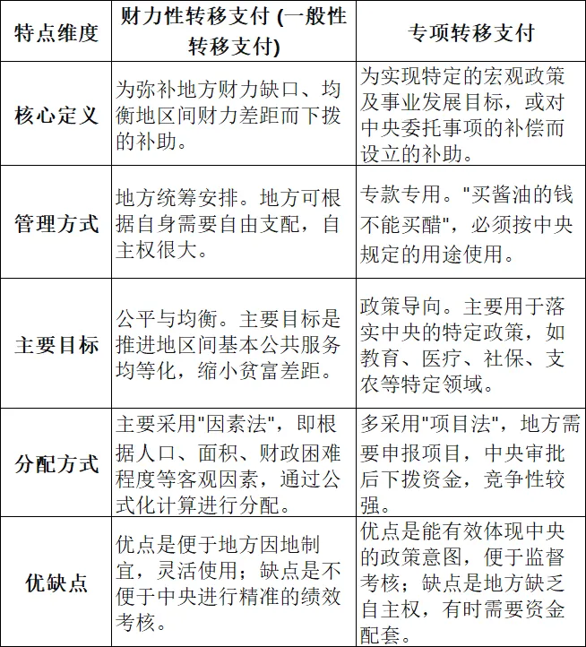 18.对地方财力性转移支付:中央对地方财力性转移支付(现在通常称为一般性转移支付),简单来说,就是中央政府为了弥补财政薄弱地区的财力缺口,促进地区间基本公共服务均等化,而拨给地方政府的补助资金。这笔钱最大的特点就是中央不规定具体用途,地方政府可以统筹安排使用,相当于一笔无条件的补助,用来充实地方的"钱袋子"。它与专款专用的"专项转移支付"正好形成互补。我们用表格对比一下: