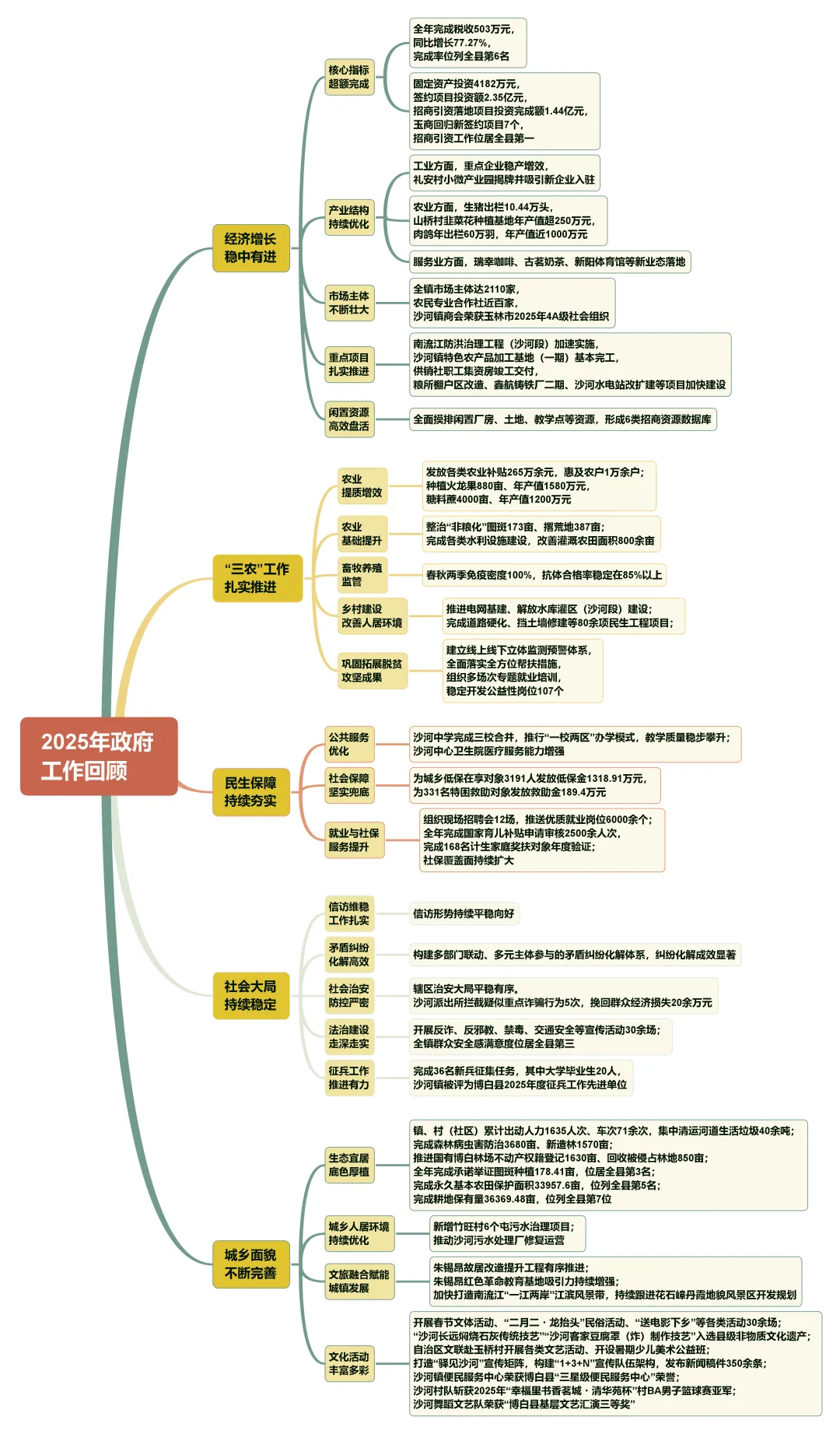 2025年是“十四五”规划收官之年,也是沙河镇砥砺奋进,追赶跨越的关键之年。在县委、县政府和镇党委的坚强领导下,在镇人大的监督支持下,我们以习近平新时代中国特色社会主义思想为指导,紧紧围绕建设清朗繁荣文明和谐美丽新玉林的“1158”目标任务体系,坚决贯彻落实县委、县政府各项决策部署,团结带领全镇干部群众,以高质量发展为首要任务,一心一意谋发展、倾情倾力惠民生,推动产业经济提档升级,民生福祉改善向好,圆满完成“十四五”规划各项收官目标。过去一年,我们主要做了以下工作: