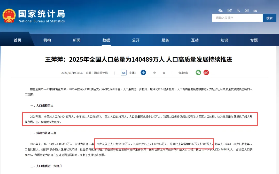 根据国家统计局数据,2025年末,我国总人口为140489万人(约14.5亿人),其中60岁及以上人口为32338万人(约3.23亿人),比2024年增加1307万人,占总人口的23%;65岁以上人口为22365万人,比2024年增加342万人,占总人口的15.9%,创历史新高。