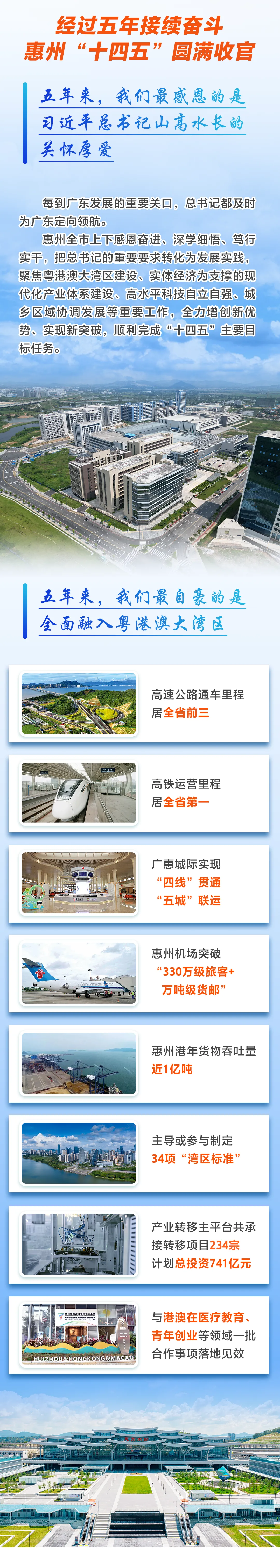 五年来,我们最自豪的是全面融入粤港澳大湾区。总书记赋予粤港澳大湾区“一点两地”的全新定位,惠州全面融深融湾的步伐更加坚定有力。“硬联通”向更深层次迈进。高速公路通车里程居全省前三,高铁运营里程居全省第一,赣深高铁、广汕高铁开通运营,广惠城际实现“四线”贯通、“五城”联运,惠州机场突破“330万级旅客+万吨级货邮”,惠州港年货物吞吐量近1亿吨。“大协同”构建更优格局。产业转移主平台共承接转移项目234宗,计划总投资741亿元,“坪清新”绿色低碳产业组团、深惠协同发展区加快推进,引进香港理工大学共建大亚湾技术创新研究院。“软联通”走向更宽领域。模块化集成建筑标准互认、绿色农产品通关便利化等取得积极进展,主导或参与制定34项“湾区标准”。“心联通”共享更暖服务。与港澳在医疗教育、青年创业等领域一批合作事项落地见效,越来越多港澳居民在惠州创业发展、乐享生活。