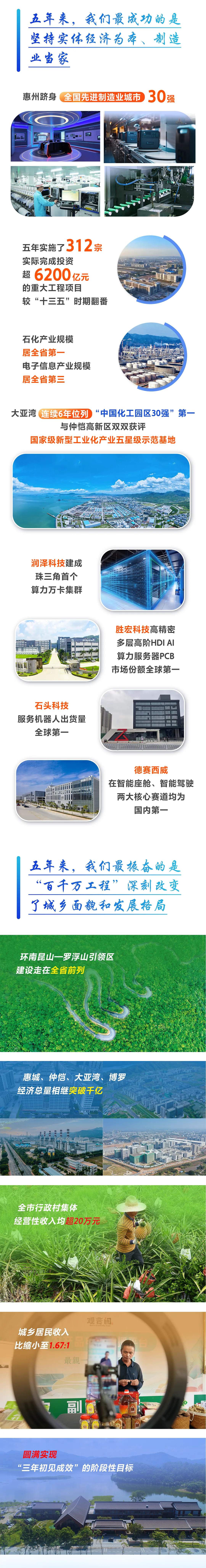 五年来,我们最成功的是坚持实体经济为本、制造业当家。坚定实施“2+1”现代产业集群、“3+7”产业园区战略,在房地产进入下行通道之前果断切入到以工业为主要支撑的发展轨道,惠州跻身全国先进制造业城市30强。大项目的支撑作用更加凸显,五年实施了312宗、实际完成投资超6200亿元的重大工程项目,较“十三五”时期翻番。石化产业规模居全省第一,炼油、乙烯、芳烃、PTA等产品产能占全省比重分别为25%、54%、50%和68%,惠州新材料产业园建设“五年初见成效”;电子信息产业规模居全省第三,其中智能终端、新型储能、核心基础电子和超高清视频4个细分领域的规模突破千亿,服务机器人、智能电视产量占全省近30%,锂离子电池占比近20%,智能音响占比近40%。园区的承载功能明显增强,大亚湾连续6年位列“中国化工园区30强”第一、获评“十四五”竞争力产业卓越化工园区,仲恺规上工业总产值突破4000亿元,双双获评国家级新型工业化产业五星级示范基地。“3+7”园区规上工业企业达2601家,较2020年净增1774家,贡献了全市73.3%的规上工业总产值和70.5%的规上工业增加值,较2020年分别提高12.7和16.8个百分点。全市高新技术企业数量翻番,建筑业产值增长超2倍。超10亿元企业由2020年的97家增至151家、超百亿企业由10家增至16家,培育了1110家省级专精特新中小企业、69家国家专精特新“小巨人”企业、28家(次)制造业单项冠军企业。抢抓人工智能和机器人新赛道,润泽科技建成珠三角首个算力万卡集群,胜宏科技高精密多层高阶HDI AI算力服务器PCB市场份额全球第一,石头科技服务机器人出货量全球第一,德赛西威在智能座舱、智能驾驶两大核心赛道均为国内第一。