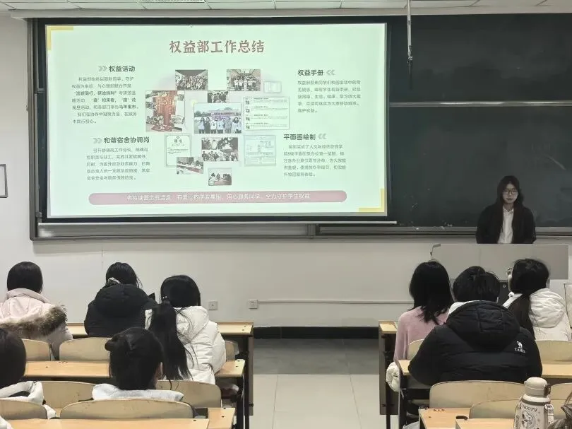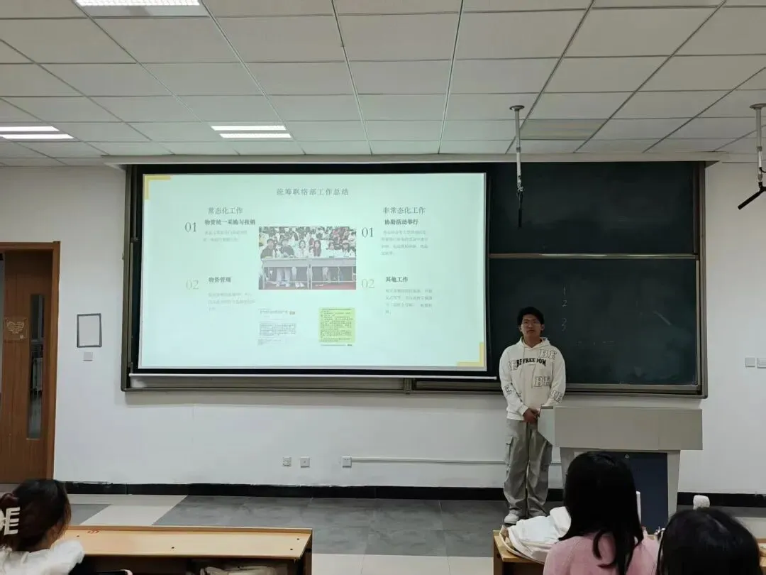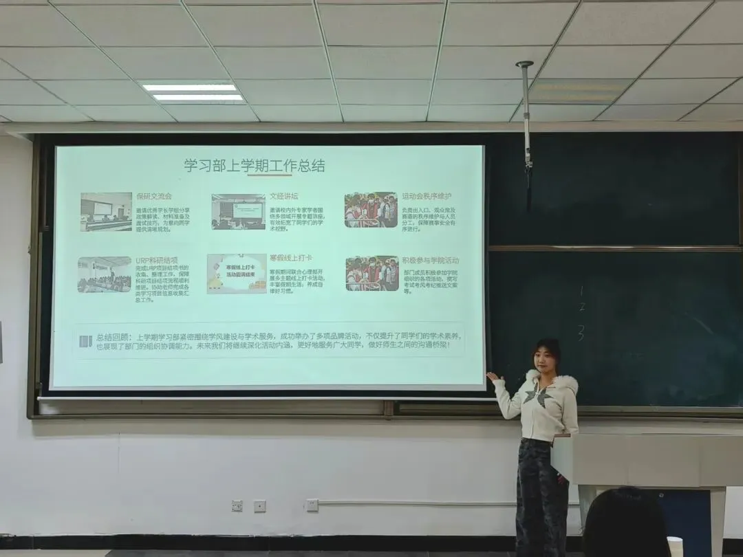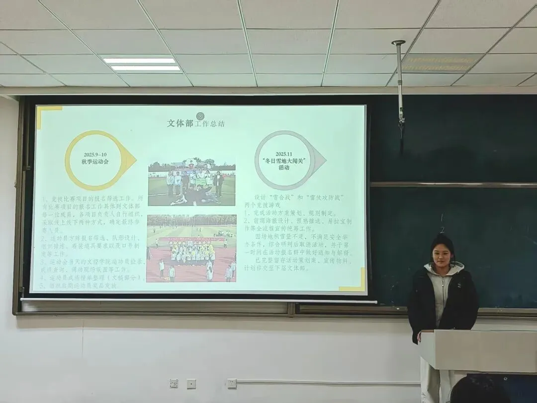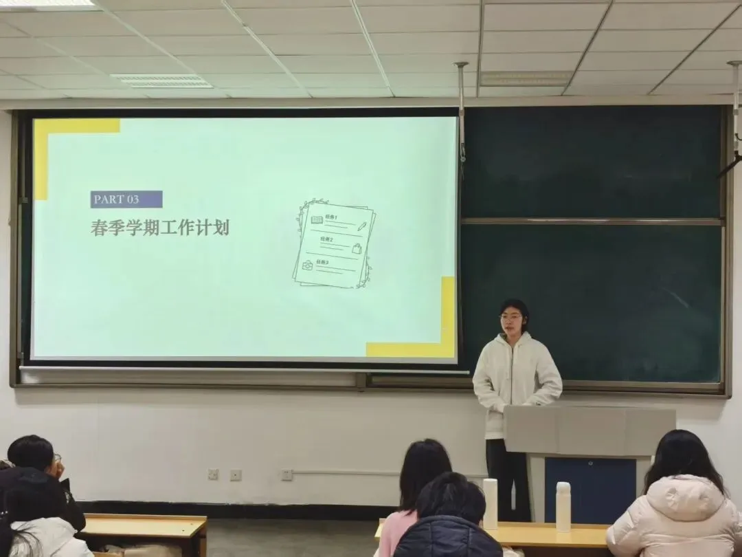 会上,学生会各部门负责人依次进行学期工作述职,分别从学习交流、活动组织、物资统筹、权益服务、心理陪伴、校园文化宣传等方面总结工作成果,分享务实经验,梳理改进方向,并结合新学期整体安排,明确了接下来的工作重点与具体计划。