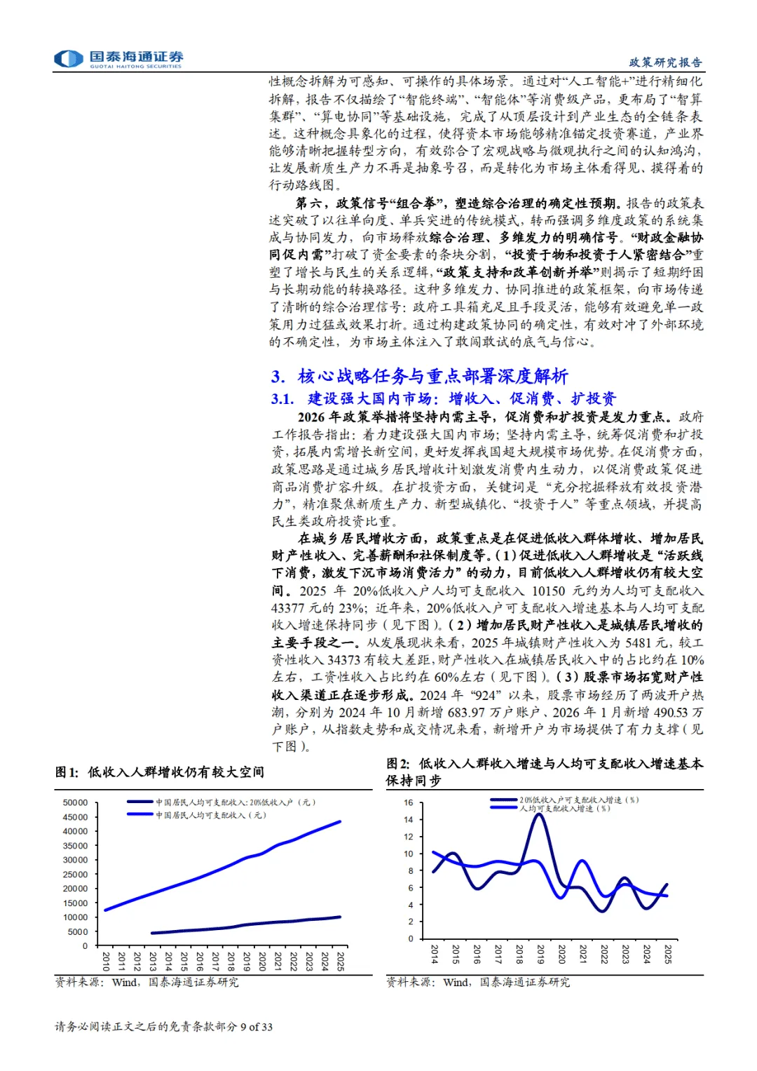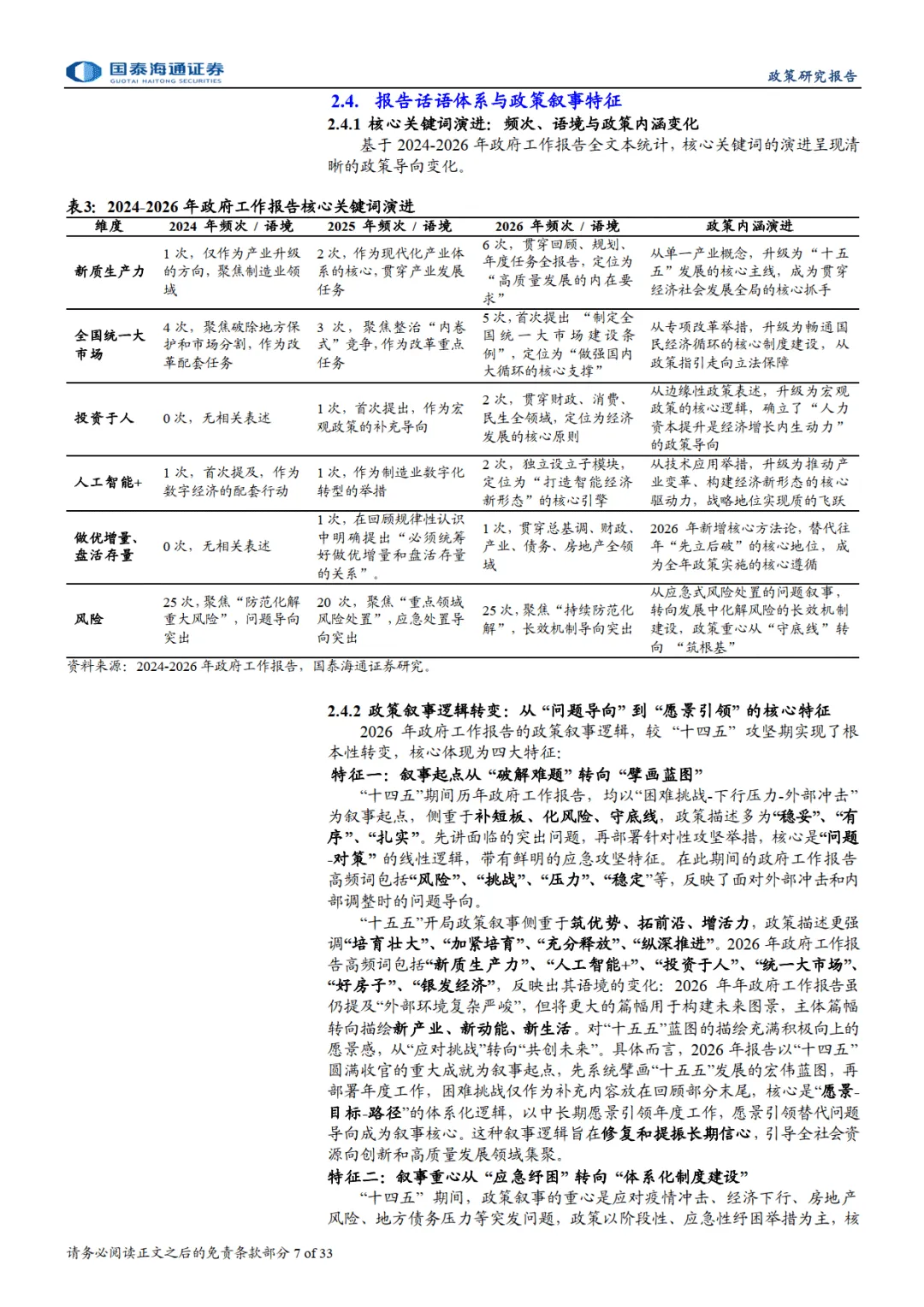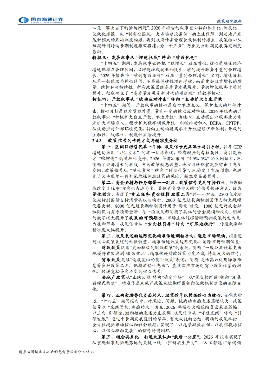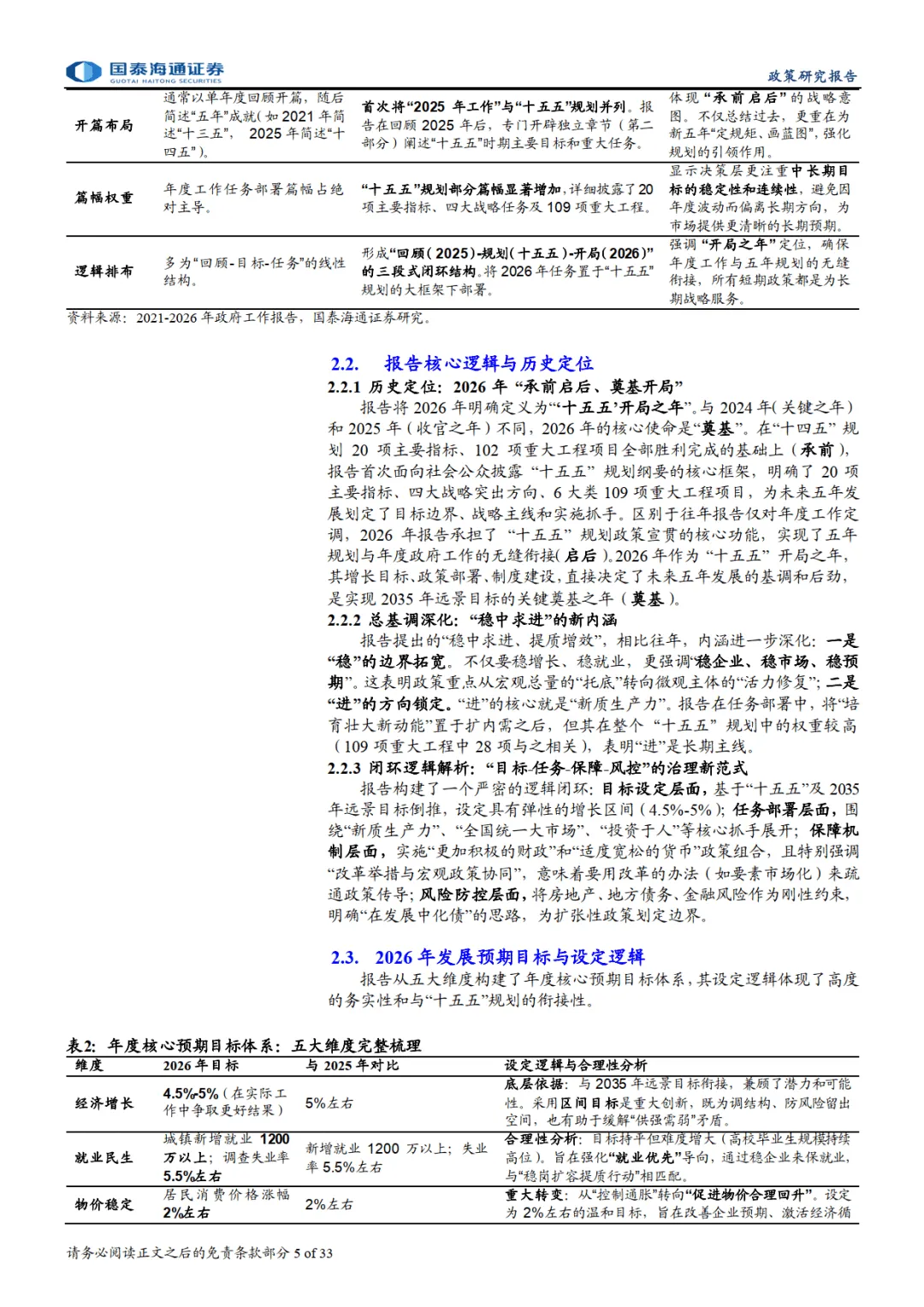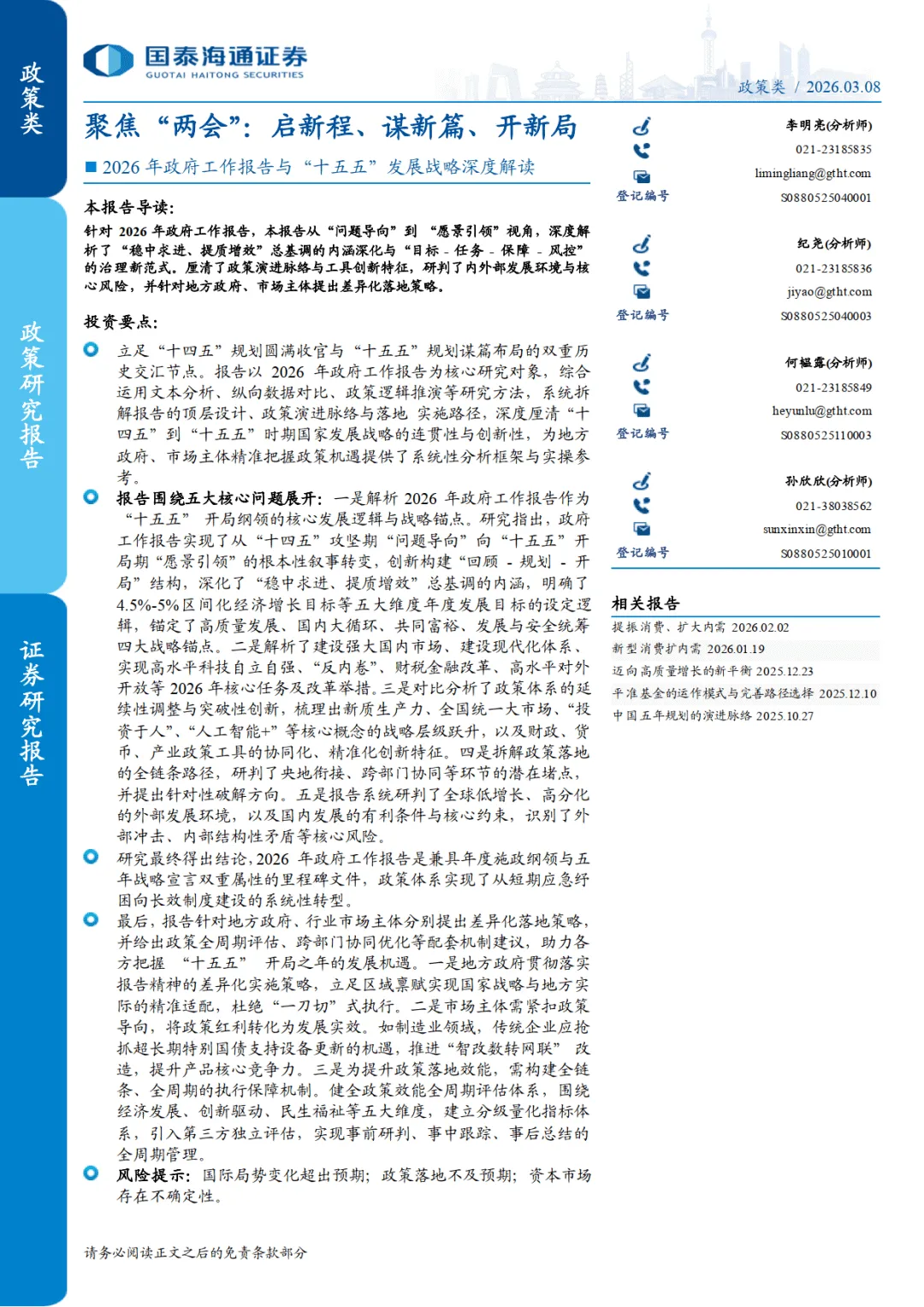 报告指出,2026 年政府工作报告实现从 “问题导向” 到 “愿景引领” 的叙事转变,构建 “回顾 - 规划 - 开局” 结构,深化 “稳中求进、提质增效” 总基调,设定 4.5%-5% 经济增长区间等五大维度年度目标,锚定高质量发展、国内大循环等四大战略锚点。同时确立 “目标 - 任务 - 保障 - 风控” 治理新范式,政策从短期纾困转向长效制度建设。