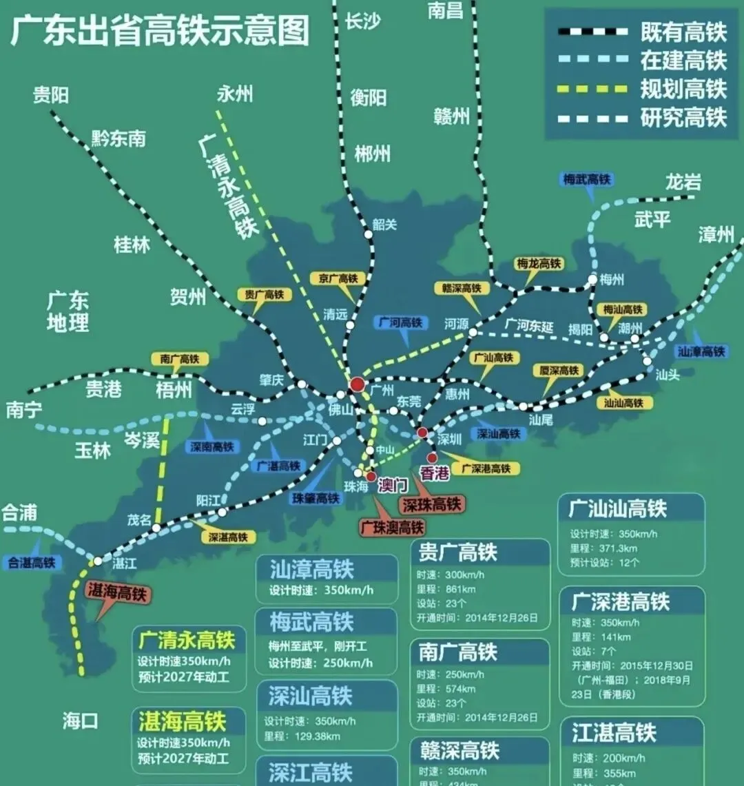 ☆广清永高铁(广州-清远-永州):设计时速 350km/h,打通广州至湖南永州新通道,衔接成渝高铁,助力粤北融入长江经济带。