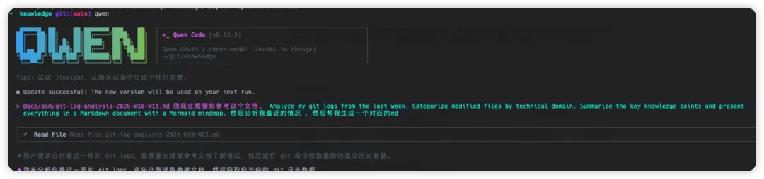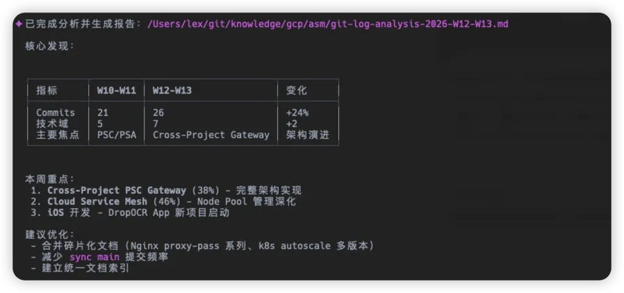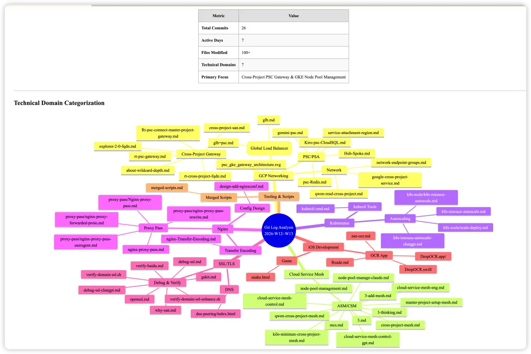 因为很多时间都是陪着 AI 聊天了,知识点和片段也会模糊的快,所以总结其实很有必要。只有总结的精准才能提高会话效率,减少 Token 浪费。精准提取核心关键字。Analyze my git logs from the last week. Categorize modified files by technical domain. Summarize the key knowledge points and present everything in a Markdown document with a Mermaid mindmap. 然后分析我最近的情况 ,然后帮我生成一个对应的md