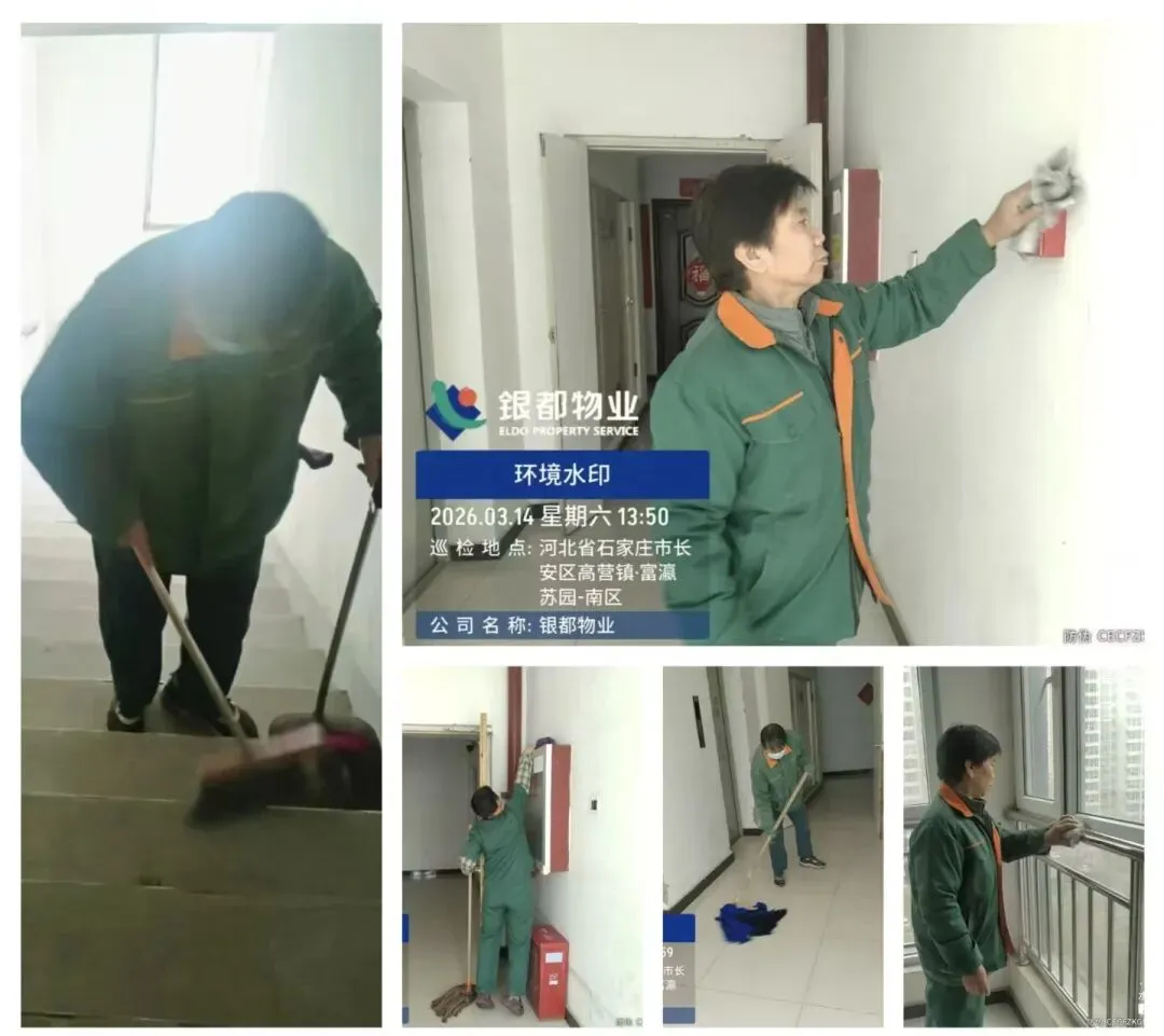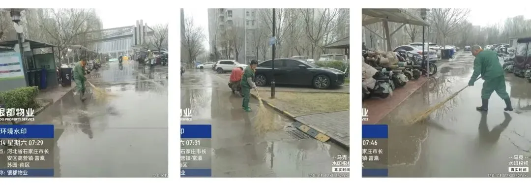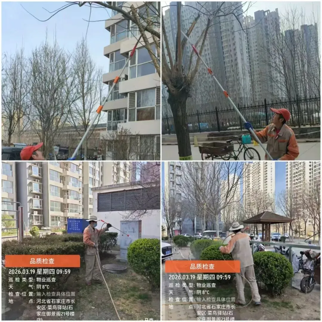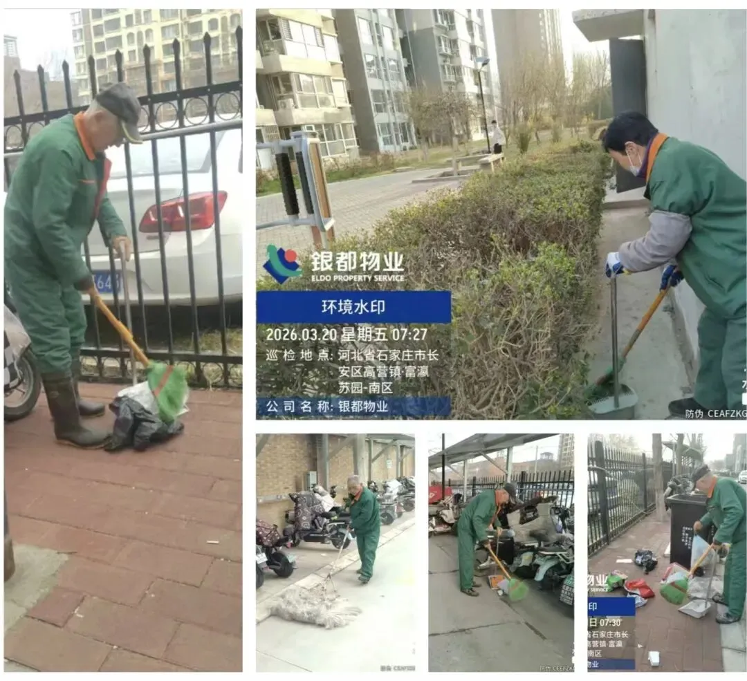 保洁穿梭于园区每个角落,擦拭公共设施,冲洗垃圾桶除臭消杀,为业主营造舒适整洁的生活环境。