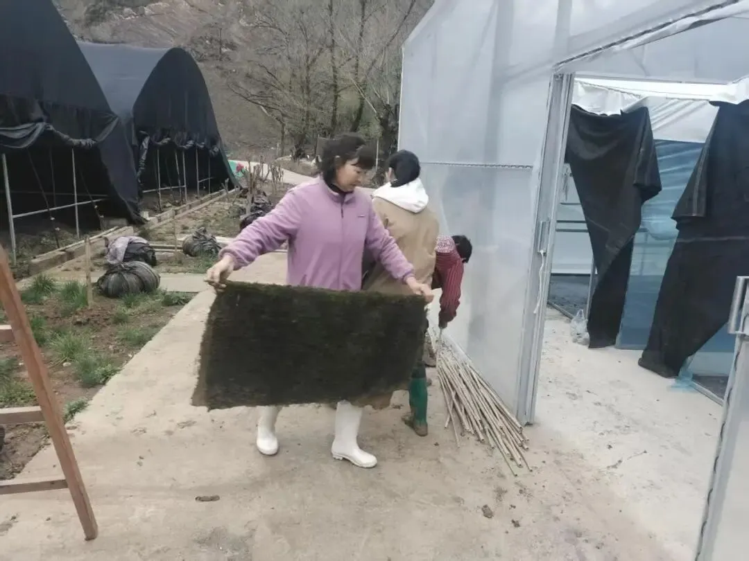 3月18日,双建村依托林科院技术支持,有序完成苔藓进棚收虫前全部工序。
