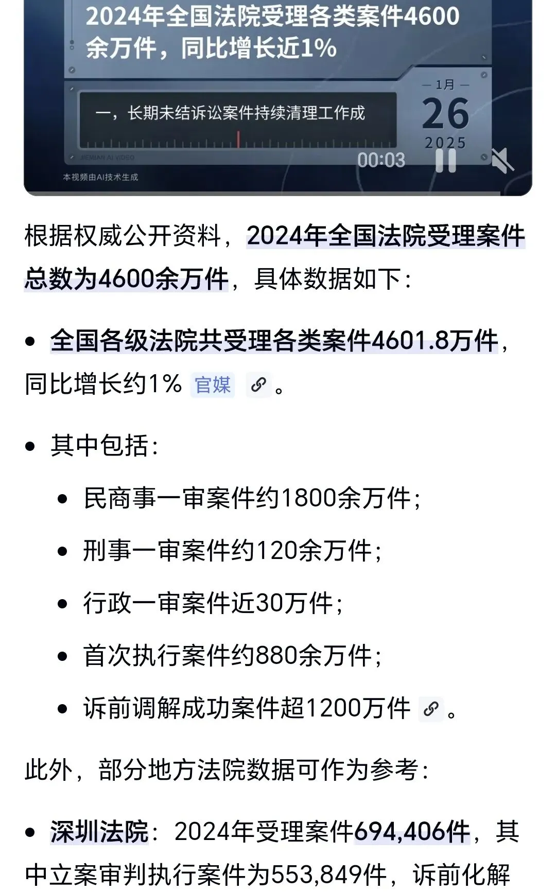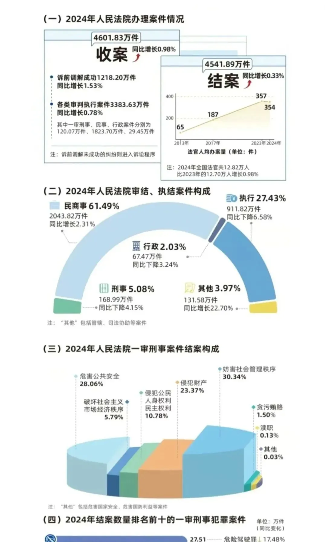 依据去年最高人民法院工作报告,2024年各级法院受理案件4600余万宗,结案4500多万宗。