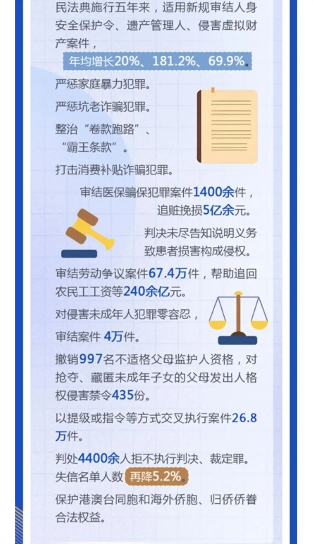 《民法典》从2021年1 月1日起施行后到2026年已五年。遗产管理人案、侵害虚拟财产案大幅度上升,医保骗保案有1400多件,追缴5亿余元,每案挽损30-40万元。