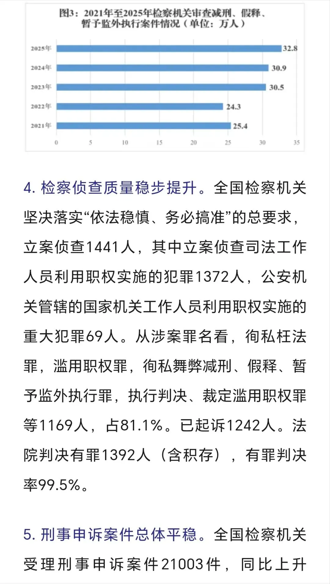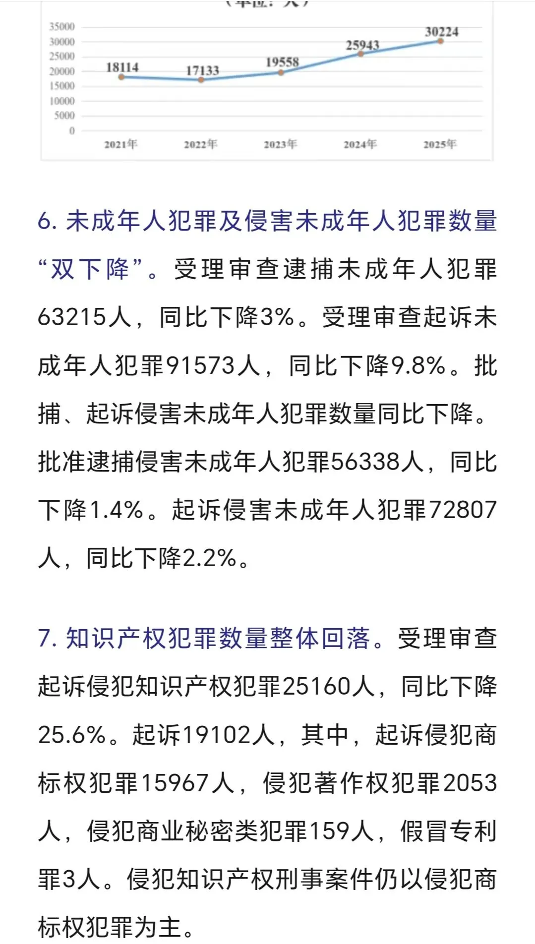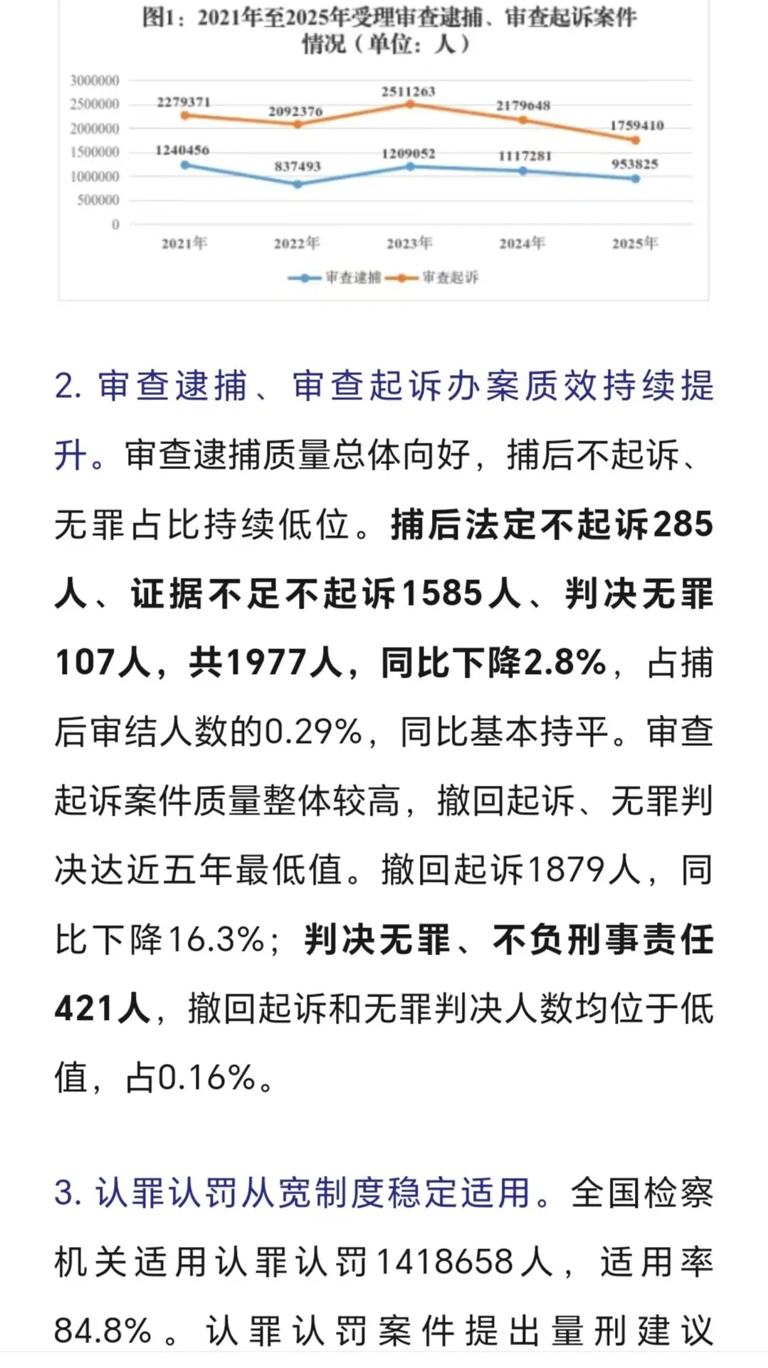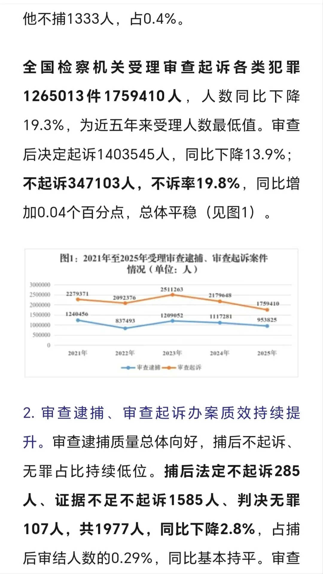 审结劳动争议案67.4万件,追回农民工工资240余亿,平均为每名工人追回3-4万,这样案件有委托律师代理的话,只能有3-5千元的代理,不会再多,多了会不合理、不合规了。 判处拒执罪,全国范围只有4400余人,惩治力度仍需加大。 全国破产案3.2万件,1400余家企业重获新生,破转活的占比约4%。帮助中小企收回账款19亿元,放在全国范围不算多,只要在买卖合同货款纠纷、加工承揽纠纷中。 四、最高人民检察院2025年工作报告呈现的主要数字。 2025年检察机关批准逮捕66.4万人,而提起公诉的则有140.4万件,若每个被告人均聘请律师,则会产生140万单的刑事辩护委托,当然其中有一定的指定法律援案件。批捕人数与公诉人数都比2024年下降一成多,分别降12%和14%。刑案数减少,社会治安总体继续向好。 起诉故杀、抢劫、绑架犯罪5.4万人,这样换算下来严重暴力案约占4%。但核准追诉案发超二十年命案凶手达380人,这类案件大多重判。 审查起诉、起诉危险驾驶犯罪大大下降,涉酒驾、醉驾交通死亡事故也下降。 各级监委移送职务犯罪3万零五百人,起诉2.9万人,原省部级44人(约占起诉职务犯罪数的千分之一点五),剩下1500人跨年起诉。起诉行贿3292人。 起诉经济犯罪13.7万人,这类被告人本身及家属有较大支付能力,是律师辩护业务收入的主要较好市场,但相对律师人数,仍增多粥少。 起诉侵犯商标、著作权、商业秘密、假冒专利1.9万人,此类案件,付费能力和付费意愿都比较高,总体数不多。 起诉未成年犯罪5.6万人,附条件不起诉1.6万人,也即未成年人初次触犯三年以下轻微犯罪占约30%。 起诉侵害未成年人案、妇女人身权益案、侵害老年人权益案分别达7.3万人、4.3万人、5.03万人。2026年3月,最高人民检察院发布了《刑事检察工作白皮书(2025)》,分六大方面,另有前言与结语,比较翔实地描写概括过去一年的刑检工作。 去年全国检察院202审查逮捕案68万件95.38万人,平均每案呈捕1.4人,批准(一般指公安或海关呈捕)和决定逮捕(指检察院自侦呈捕、监委移送)66.4万人,不批捕达32.5万人,不捕率高大34.1%,证据不足不捕占16.4万人50.7%超过一半,无逮捕必要不捕14.3万人占44.1%(这个有弹性掌握空间),不构罪即绝对不捕7061人占2.2%,不符合徒刑条件即可判拘役不捕8474人占2.6%,可以监视居住不捕1333人占0.4%。 审查起诉各类犯罪126.5万件179.5万人,平均每案1.41人,下降19.3%近两成,是五年来最低,即2025年犯罪人数五年最少,比2021年、2022年疫情期间都低。不起诉34.7万人,不诉率19.3%。但捕后不起诉、无罪比非常低,共只有1977人,法定不起诉285人,证据不足不诉1585人,判决无罪107人,另撤回起诉1879人。 这在充分说明在捕诉合一检察机制下,要争取犯罪嫌疑人的最大合法权益,必要提前、尽早委托律师介入,在检察院审查逮捕及审查起诉环节及之前聘请辩护律师,效果及结果都会最好。 认罪认罚率84.8%、检察院量刑建议被法院采纳率86%。 检察机关立案监督6.4万件,应立不立监督1.7万,不应立而立监督4.4万件。 对刑事裁判提出抗诉5778件,法院审结4713件,改判、发回重审3351件,即检察院提起抗诉,法院维持率仍有近三,变更刑判的占71.1%。 监狱内减刑、假释、暂予监外执行案件32.8万人,所有监狱内的此类案件,均需要报检察官审查后再报监狱所在的中级法院审理出裁定。检察院自侦立案1441人,自从2018年《监察法》实施后,检察机关侦查职能绝大部分转隶到监委。 全国检察院受理刑事申诉案件2.1万件,不服法院裁判1.5万件,占七成余,不服检察机关处理有五千多件,占26.8%。 控申部门办理20678件占九成八,直接审查结案13069件,即六成三的刑事申诉在检察院初筛即未成年通过,移送刑检部门再办理7000件余件,占三成七,刑检再结案的2811件,决定复查4552件,复查此61.8%,增加了18%。刑检部门提出监督意见487件,再占复查的13.6%,即对刑事申诉真正提请、提出检察监督的只有百分之两点三(487/21003) 轻微犯罪占比八成以上,相对不诉、附文件不诉、判三年以下刑罚的149.7万,占全部审结人数的八成五,而判一年以下刑罚的人数74.4万占被公诉全部被告人的四成多。 2024、2025年全国排名前十的罪名不变:危险驾驶、盗窃、诈骗、掩饰隐瞒犯罪所得罪、开设赌场、故意伤害、强奸、帮信、毒品犯罪。2024起诉强奸案3.8万件、2025年起诉强奸案3.5万件,略有下降,这与最高检2025年工作报告提到侵害妇女人身权益犯罪4.3万相符,除了强奸外,还有强制猥亵及对妇女的故意伤害或杀人或拐卖等。