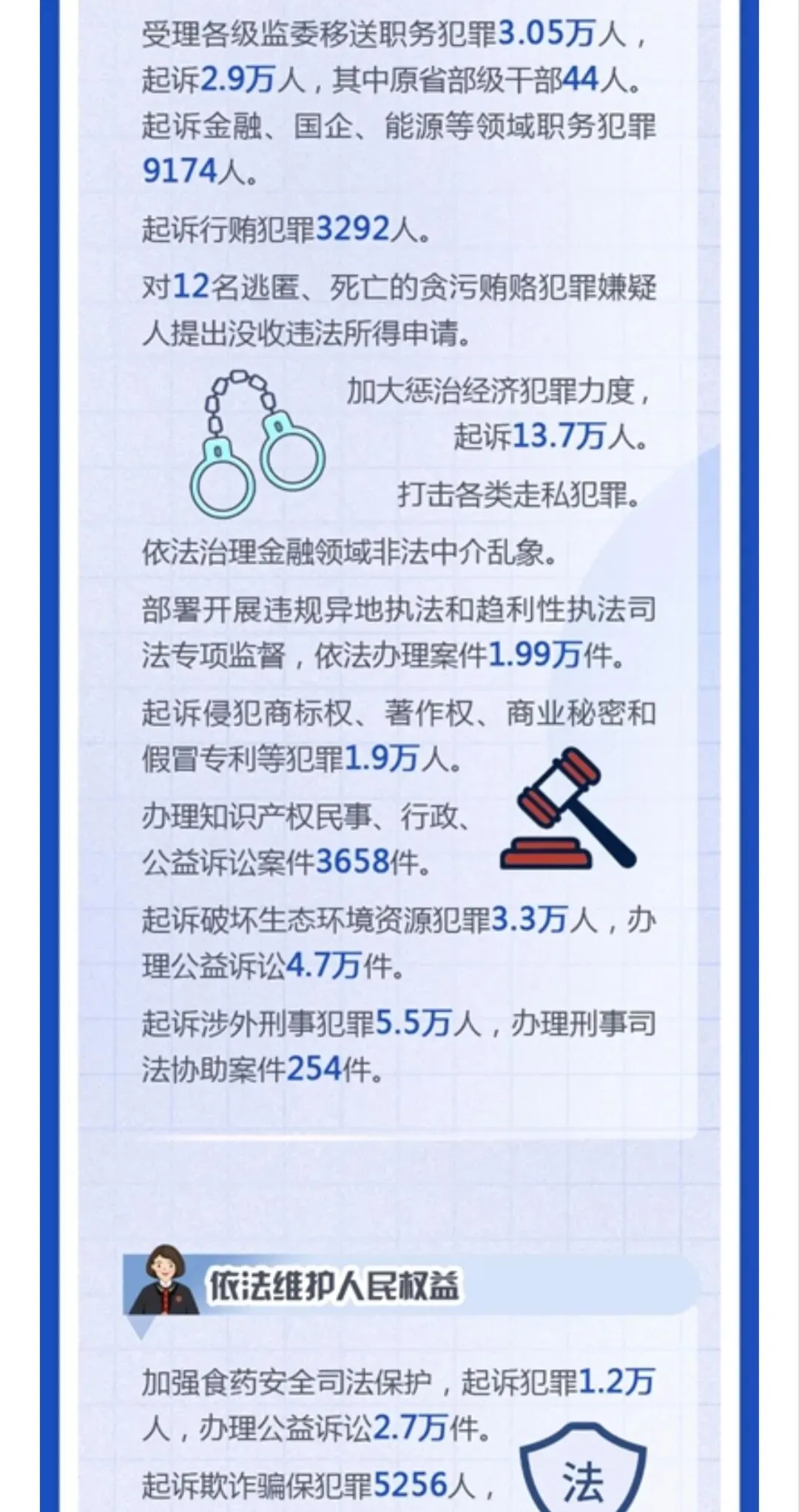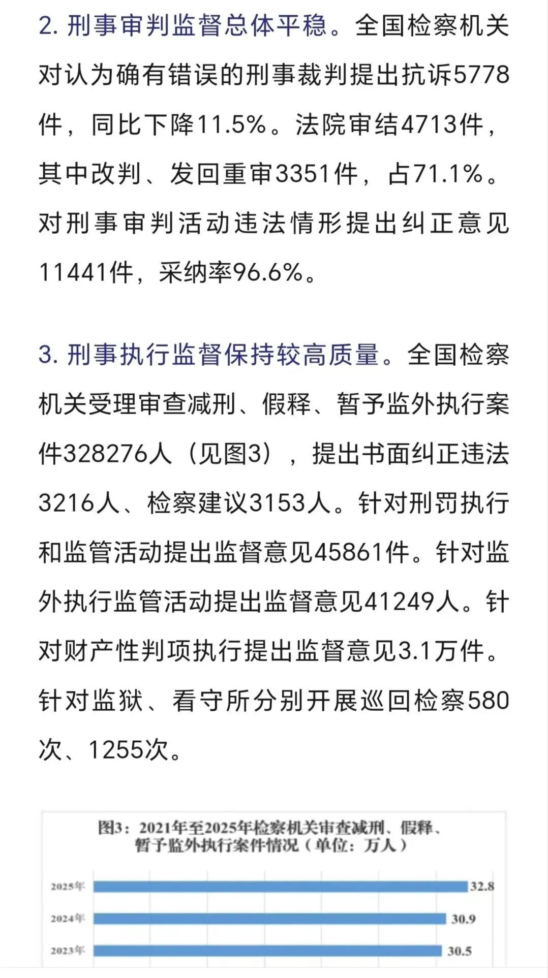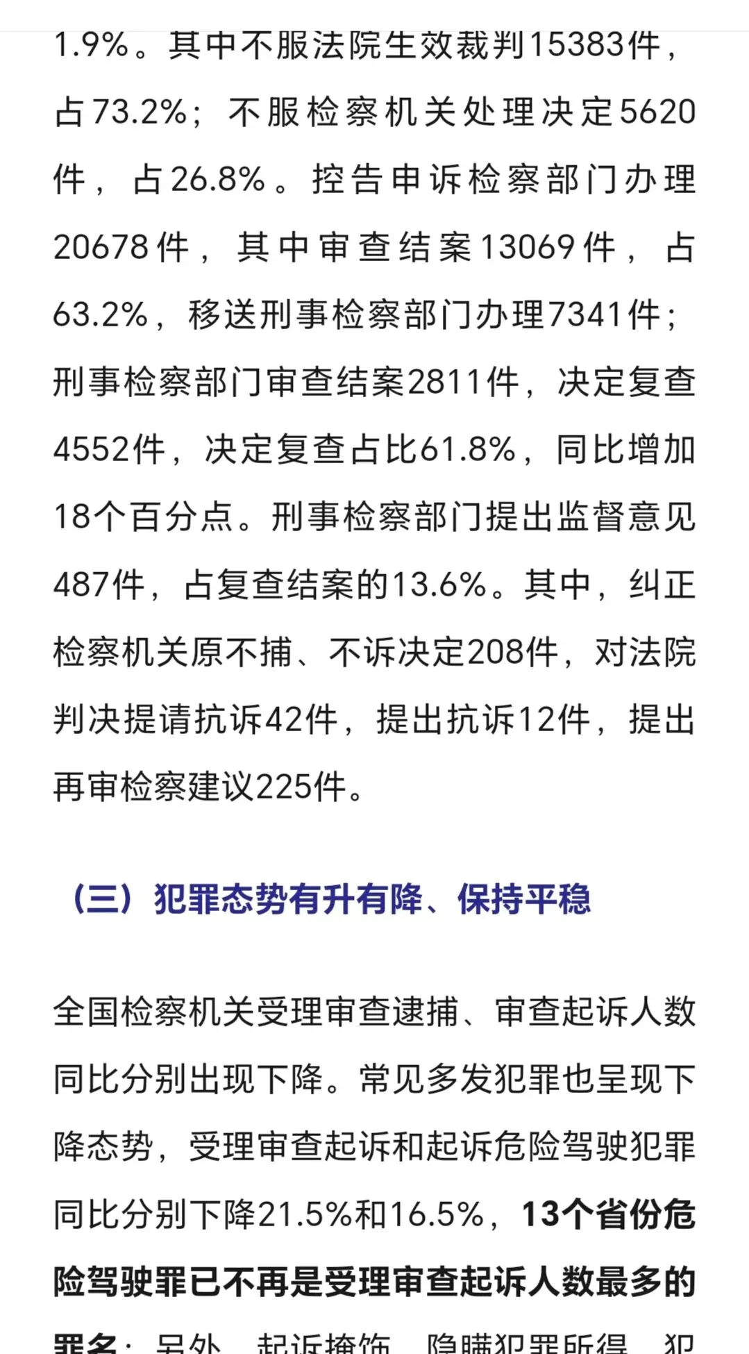 审结劳动争议案67.4万件,追回农民工工资240余亿,平均为每名工人追回3-4万,这样案件有委托律师代理的话,只能有3-5千元的代理,不会再多,多了会不合理、不合规了。 判处拒执罪,全国范围只有4400余人,惩治力度仍需加大。 全国破产案3.2万件,1400余家企业重获新生,破转活的占比约4%。帮助中小企收回账款19亿元,放在全国范围不算多,只要在买卖合同货款纠纷、加工承揽纠纷中。 四、最高人民检察院2025年工作报告呈现的主要数字。 2025年检察机关批准逮捕66.4万人,而提起公诉的则有140.4万件,若每个被告人均聘请律师,则会产生140万单的刑事辩护委托,当然其中有一定的指定法律援案件。批捕人数与公诉人数都比2024年下降一成多,分别降12%和14%。刑案数减少,社会治安总体继续向好。 起诉故杀、抢劫、绑架犯罪5.4万人,这样换算下来严重暴力案约占4%。但核准追诉案发超二十年命案凶手达380人,这类案件大多重判。 审查起诉、起诉危险驾驶犯罪大大下降,涉酒驾、醉驾交通死亡事故也下降。 各级监委移送职务犯罪3万零五百人,起诉2.9万人,原省部级44人(约占起诉职务犯罪数的千分之一点五),剩下1500人跨年起诉。起诉行贿3292人。 起诉经济犯罪13.7万人,这类被告人本身及家属有较大支付能力,是律师辩护业务收入的主要较好市场,但相对律师人数,仍增多粥少。 起诉侵犯商标、著作权、商业秘密、假冒专利1.9万人,此类案件,付费能力和付费意愿都比较高,总体数不多。 起诉未成年犯罪5.6万人,附条件不起诉1.6万人,也即未成年人初次触犯三年以下轻微犯罪占约30%。 起诉侵害未成年人案、妇女人身权益案、侵害老年人权益案分别达7.3万人、4.3万人、5.03万人。2026年3月,最高人民检察院发布了《刑事检察工作白皮书(2025)》,分六大方面,另有前言与结语,比较翔实地描写概括过去一年的刑检工作。 去年全国检察院202审查逮捕案68万件95.38万人,平均每案呈捕1.4人,批准(一般指公安或海关呈捕)和决定逮捕(指检察院自侦呈捕、监委移送)66.4万人,不批捕达32.5万人,不捕率高大34.1%,证据不足不捕占16.4万人50.7%超过一半,无逮捕必要不捕14.3万人占44.1%(这个有弹性掌握空间),不构罪即绝对不捕7061人占2.2%,不符合徒刑条件即可判拘役不捕8474人占2.6%,可以监视居住不捕1333人占0.4%。 审查起诉各类犯罪126.5万件179.5万人,平均每案1.41人,下降19.3%近两成,是五年来最低,即2025年犯罪人数五年最少,比2021年、2022年疫情期间都低。不起诉34.7万人,不诉率19.3%。但捕后不起诉、无罪比非常低,共只有1977人,法定不起诉285人,证据不足不诉1585人,判决无罪107人,另撤回起诉1879人。 这在充分说明在捕诉合一检察机制下,要争取犯罪嫌疑人的最大合法权益,必要提前、尽早委托律师介入,在检察院审查逮捕及审查起诉环节及之前聘请辩护律师,效果及结果都会最好。 认罪认罚率84.8%、检察院量刑建议被法院采纳率86%。 检察机关立案监督6.4万件,应立不立监督1.7万,不应立而立监督4.4万件。 对刑事裁判提出抗诉5778件,法院审结4713件,改判、发回重审3351件,即检察院提起抗诉,法院维持率仍有近三,变更刑判的占71.1%。 监狱内减刑、假释、暂予监外执行案件32.8万人,所有监狱内的此类案件,均需要报检察官审查后再报监狱所在的中级法院审理出裁定。检察院自侦立案1441人,自从2018年《监察法》实施后,检察机关侦查职能绝大部分转隶到监委。 全国检察院受理刑事申诉案件2.1万件,不服法院裁判1.5万件,占七成余,不服检察机关处理有五千多件,占26.8%。 控申部门办理20678件占九成八,直接审查结案13069件,即六成三的刑事申诉在检察院初筛即未成年通过,移送刑检部门再办理7000件余件,占三成七,刑检再结案的2811件,决定复查4552件,复查此61.8%,增加了18%。刑检部门提出监督意见487件,再占复查的13.6%,即对刑事申诉真正提请、提出检察监督的只有百分之两点三(487/21003) 轻微犯罪占比八成以上,相对不诉、附文件不诉、判三年以下刑罚的149.7万,占全部审结人数的八成五,而判一年以下刑罚的人数74.4万占被公诉全部被告人的四成多。 2024、2025年全国排名前十的罪名不变:危险驾驶、盗窃、诈骗、掩饰隐瞒犯罪所得罪、开设赌场、故意伤害、强奸、帮信、毒品犯罪。2024起诉强奸案3.8万件、2025年起诉强奸案3.5万件,略有下降,这与最高检2025年工作报告提到侵害妇女人身权益犯罪4.3万相符,除了强奸外,还有强制猥亵及对妇女的故意伤害或杀人或拐卖等。