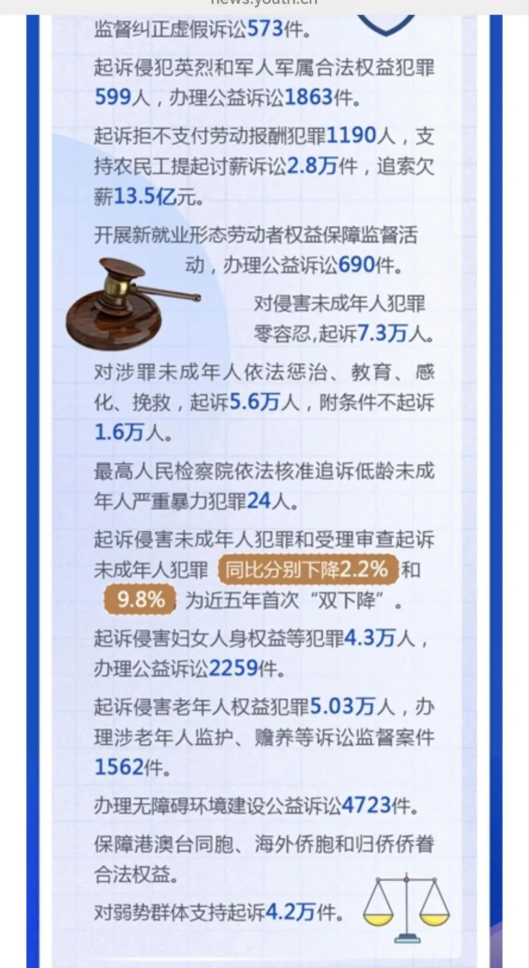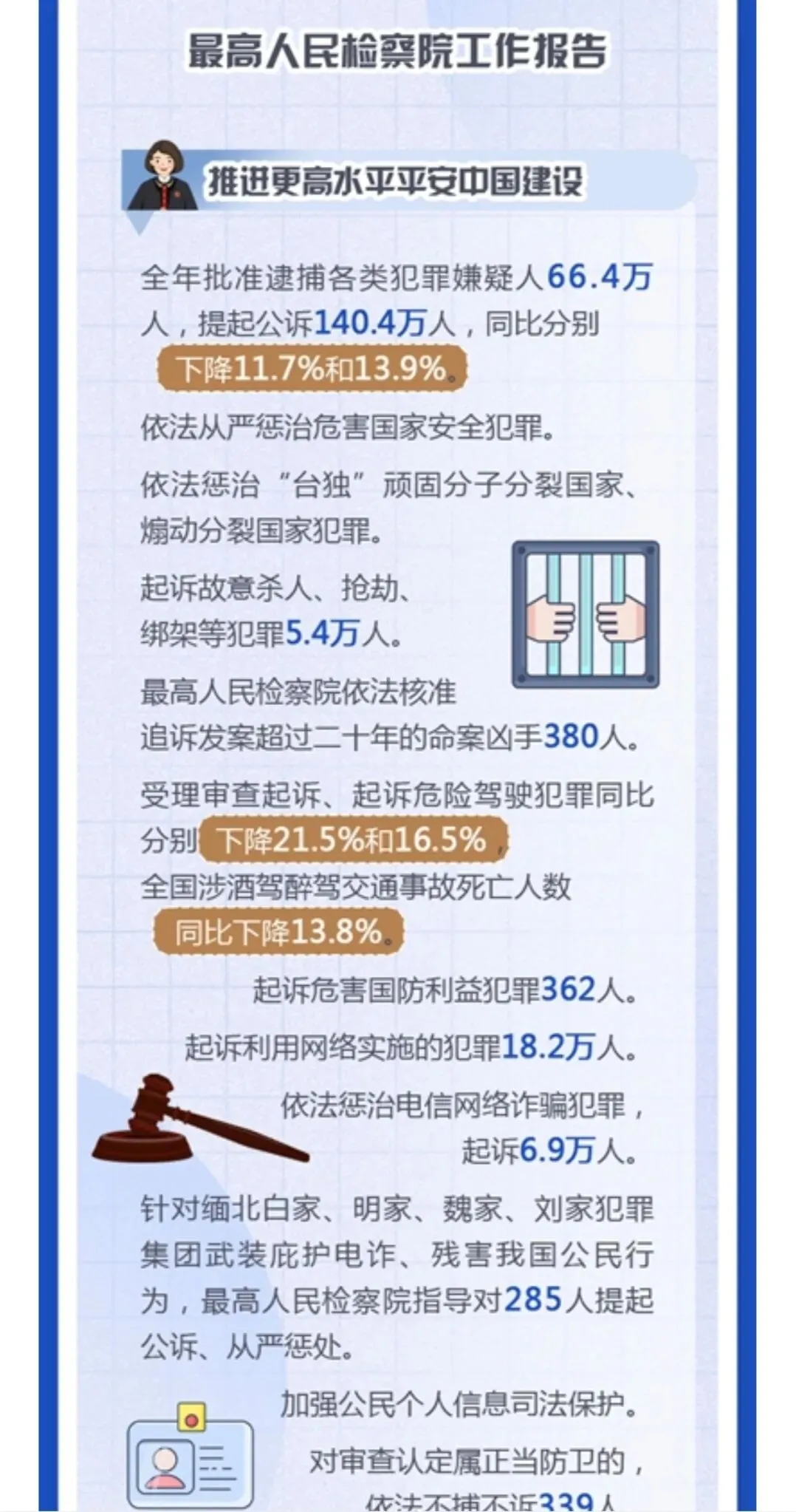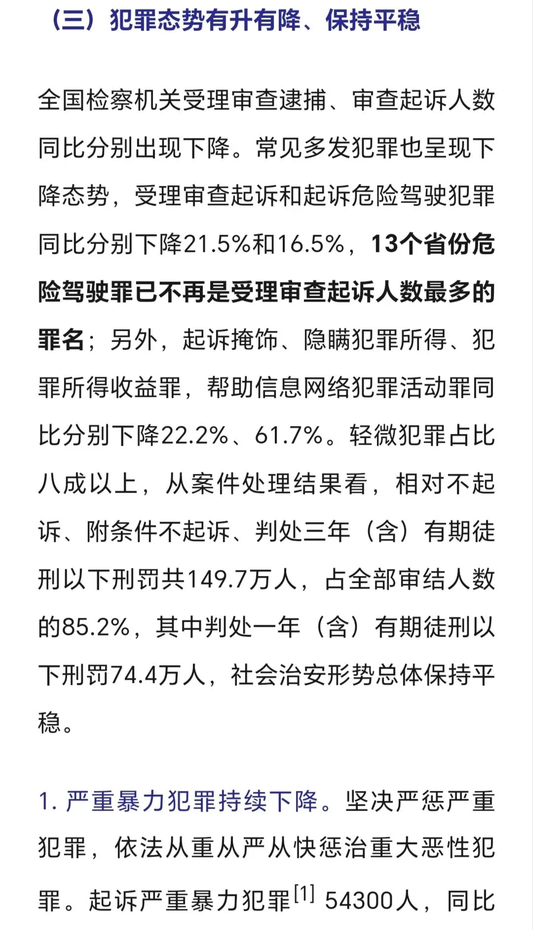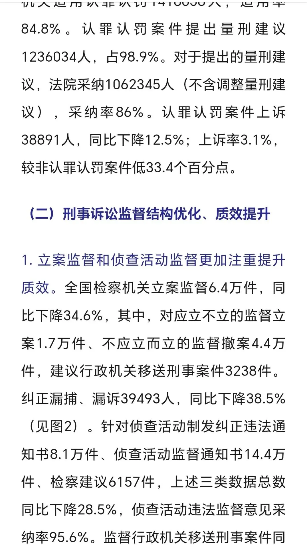 审结劳动争议案67.4万件,追回农民工工资240余亿,平均为每名工人追回3-4万,这样案件有委托律师代理的话,只能有3-5千元的代理,不会再多,多了会不合理、不合规了。 判处拒执罪,全国范围只有4400余人,惩治力度仍需加大。 全国破产案3.2万件,1400余家企业重获新生,破转活的占比约4%。帮助中小企收回账款19亿元,放在全国范围不算多,只要在买卖合同货款纠纷、加工承揽纠纷中。 四、最高人民检察院2025年工作报告呈现的主要数字。 2025年检察机关批准逮捕66.4万人,而提起公诉的则有140.4万件,若每个被告人均聘请律师,则会产生140万单的刑事辩护委托,当然其中有一定的指定法律援案件。批捕人数与公诉人数都比2024年下降一成多,分别降12%和14%。刑案数减少,社会治安总体继续向好。 起诉故杀、抢劫、绑架犯罪5.4万人,这样换算下来严重暴力案约占4%。但核准追诉案发超二十年命案凶手达380人,这类案件大多重判。 审查起诉、起诉危险驾驶犯罪大大下降,涉酒驾、醉驾交通死亡事故也下降。 各级监委移送职务犯罪3万零五百人,起诉2.9万人,原省部级44人(约占起诉职务犯罪数的千分之一点五),剩下1500人跨年起诉。起诉行贿3292人。 起诉经济犯罪13.7万人,这类被告人本身及家属有较大支付能力,是律师辩护业务收入的主要较好市场,但相对律师人数,仍增多粥少。 起诉侵犯商标、著作权、商业秘密、假冒专利1.9万人,此类案件,付费能力和付费意愿都比较高,总体数不多。 起诉未成年犯罪5.6万人,附条件不起诉1.6万人,也即未成年人初次触犯三年以下轻微犯罪占约30%。 起诉侵害未成年人案、妇女人身权益案、侵害老年人权益案分别达7.3万人、4.3万人、5.03万人。2026年3月,最高人民检察院发布了《刑事检察工作白皮书(2025)》,分六大方面,另有前言与结语,比较翔实地描写概括过去一年的刑检工作。 去年全国检察院202审查逮捕案68万件95.38万人,平均每案呈捕1.4人,批准(一般指公安或海关呈捕)和决定逮捕(指检察院自侦呈捕、监委移送)66.4万人,不批捕达32.5万人,不捕率高大34.1%,证据不足不捕占16.4万人50.7%超过一半,无逮捕必要不捕14.3万人占44.1%(这个有弹性掌握空间),不构罪即绝对不捕7061人占2.2%,不符合徒刑条件即可判拘役不捕8474人占2.6%,可以监视居住不捕1333人占0.4%。 审查起诉各类犯罪126.5万件179.5万人,平均每案1.41人,下降19.3%近两成,是五年来最低,即2025年犯罪人数五年最少,比2021年、2022年疫情期间都低。不起诉34.7万人,不诉率19.3%。但捕后不起诉、无罪比非常低,共只有1977人,法定不起诉285人,证据不足不诉1585人,判决无罪107人,另撤回起诉1879人。 这在充分说明在捕诉合一检察机制下,要争取犯罪嫌疑人的最大合法权益,必要提前、尽早委托律师介入,在检察院审查逮捕及审查起诉环节及之前聘请辩护律师,效果及结果都会最好。 认罪认罚率84.8%、检察院量刑建议被法院采纳率86%。 检察机关立案监督6.4万件,应立不立监督1.7万,不应立而立监督4.4万件。 对刑事裁判提出抗诉5778件,法院审结4713件,改判、发回重审3351件,即检察院提起抗诉,法院维持率仍有近三,变更刑判的占71.1%。 监狱内减刑、假释、暂予监外执行案件32.8万人,所有监狱内的此类案件,均需要报检察官审查后再报监狱所在的中级法院审理出裁定。检察院自侦立案1441人,自从2018年《监察法》实施后,检察机关侦查职能绝大部分转隶到监委。 全国检察院受理刑事申诉案件2.1万件,不服法院裁判1.5万件,占七成余,不服检察机关处理有五千多件,占26.8%。 控申部门办理20678件占九成八,直接审查结案13069件,即六成三的刑事申诉在检察院初筛即未成年通过,移送刑检部门再办理7000件余件,占三成七,刑检再结案的2811件,决定复查4552件,复查此61.8%,增加了18%。刑检部门提出监督意见487件,再占复查的13.6%,即对刑事申诉真正提请、提出检察监督的只有百分之两点三(487/21003) 轻微犯罪占比八成以上,相对不诉、附文件不诉、判三年以下刑罚的149.7万,占全部审结人数的八成五,而判一年以下刑罚的人数74.4万占被公诉全部被告人的四成多。 2024、2025年全国排名前十的罪名不变:危险驾驶、盗窃、诈骗、掩饰隐瞒犯罪所得罪、开设赌场、故意伤害、强奸、帮信、毒品犯罪。2024起诉强奸案3.8万件、2025年起诉强奸案3.5万件,略有下降,这与最高检2025年工作报告提到侵害妇女人身权益犯罪4.3万相符,除了强奸外,还有强制猥亵及对妇女的故意伤害或杀人或拐卖等。