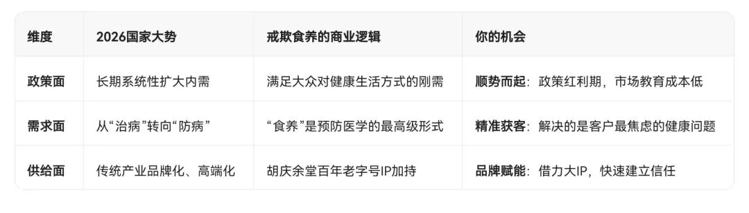 * 信任红利: 国家强调“破除地方保护,优化供给”。拥有百年老字号背书的“戒欺食养”,自带极高的信任门槛,这在信任稀缺的当下,就是最硬的通货。