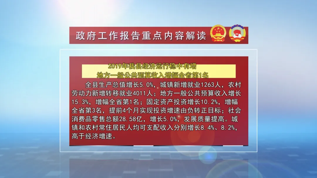 全县生产总值增长5.0%,城镇新增就业1263人,农村劳动力新增转移就业4011人;地方一般公共预算收入增长15.3%,增幅全省第1名;固定资产投资增长10.2%,增幅全省第3名,提前4个月实现投资增速由负转正目标;社会消费品零售总额28.58亿,增长5.0%,发展质量提高。城镇和农村常住居民人均可支配收入分别增长8.4%、8.2%,高于经济增速。