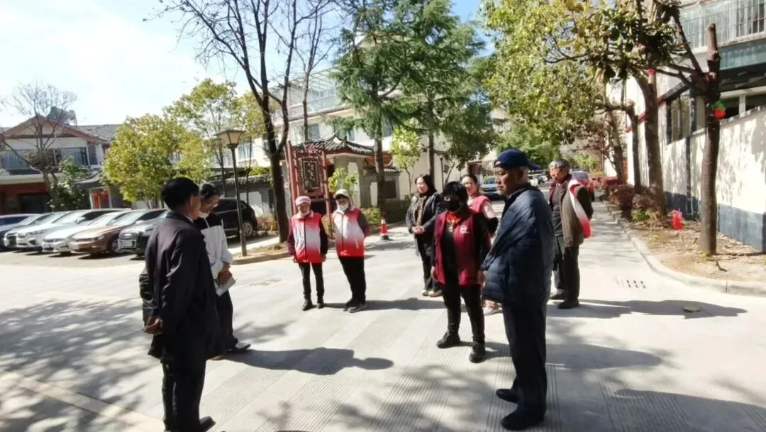 社区工作人员对红色物业各个小区卫生,消防器械等进行检查保障居民居住体验和安全。