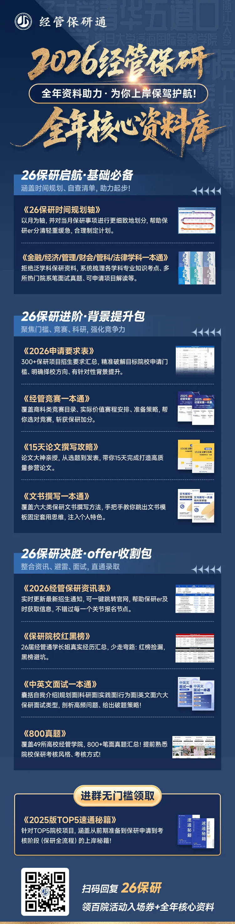 此外,还有经管保研通核心秘籍!专精TOP院校冲刺的《TOP5速通秘籍》,一本讲透从前期准备到保研申请到考核流程,直接无门槛送给大家!