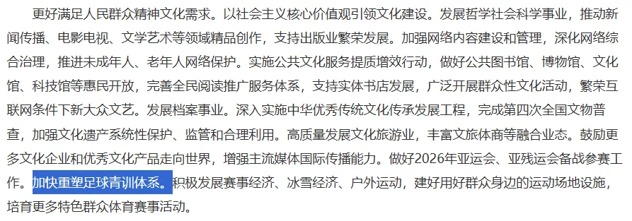 朱健文:报告中提及青训的部分,是在“更好满足人民群众精神文化需求”这个话题下出现的。这部分内容还出现了其他体育工作的内容,包括备战参加亚运会,发展赛事经济、户外经济、冰雪经济,建设体育场地、发展群众体育运动。有仔细阅读过去年重量级体育产业政策“31号文”的朋友应该都有印象,除了亚运会、足球青训之外,政府工作报告提到的体育相关工作,都是长期性、战略性的宏观工作,在“31号文”中有过强调。