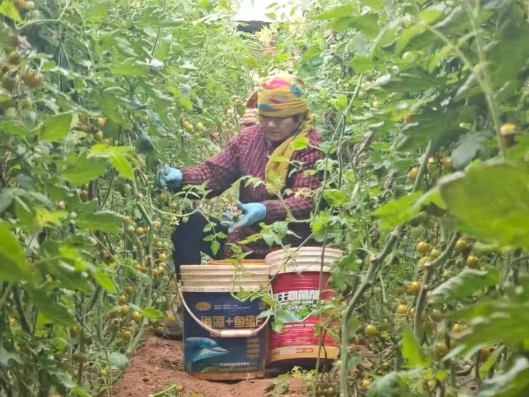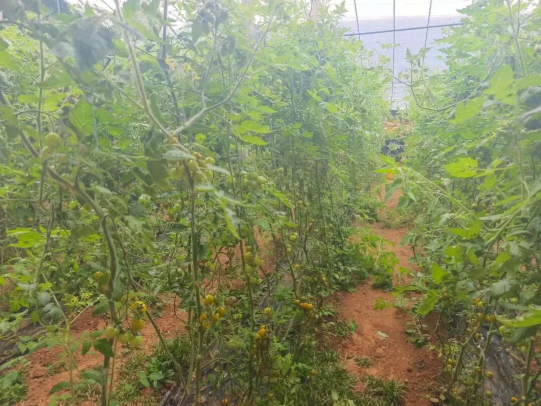 石家河黄山大棚整齐排列,棚内红彤彤的西红柿挂满枝头,色泽鲜亮、圆润饱满,迎来了又一年的丰收季。