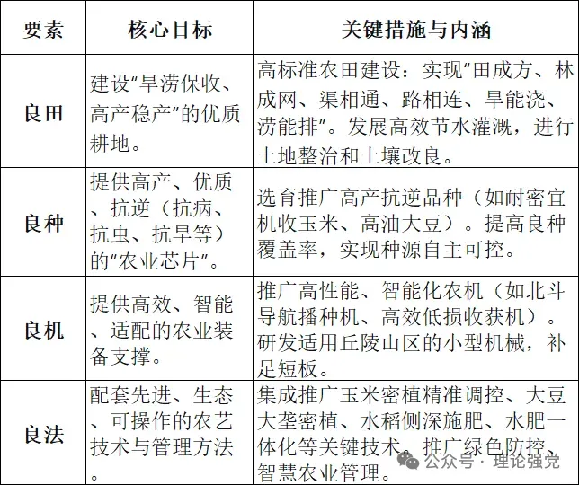 13.促进良田良种良机良法集成增效:促进良田、良种、良机、良法集成增效,核心是通过把这四个关键农业要素系统性地融合在一起,打破它们各自独立的局限,以实现1+1+1+1 > 4的综合效果,最终目标是全面提升粮食单产、品质和农业效益。这是“藏粮于地、藏粮于技”战略的具体化和系统化实践。