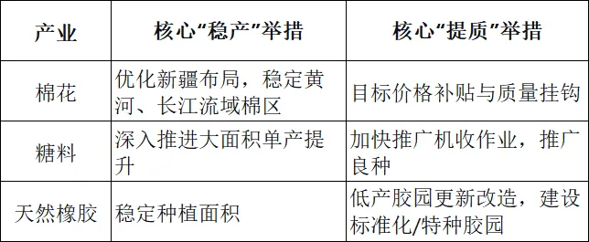 14.棉糖胶:是棉花、糖料、天然橡胶这三种重要经济作物的合称。推动棉糖胶等稳产提质的核心举措如下: