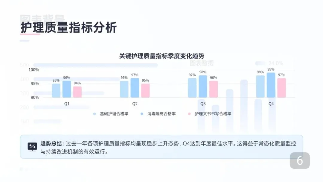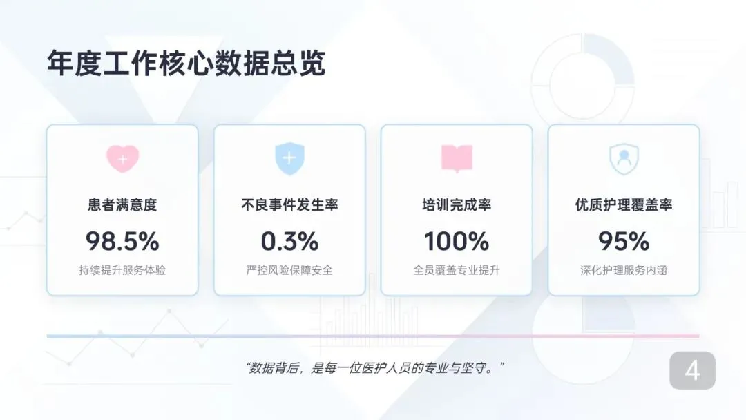 患者满意度98.5%,不良事件发生率0.3%,培训完成率100%,优质护理覆盖率95%