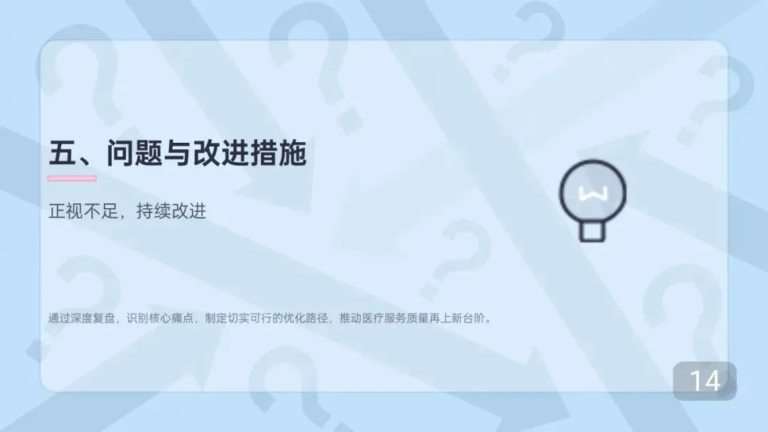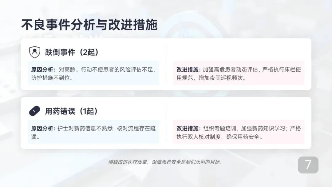 建立全程质量监控+持续改进机制,针对不良事件深挖原因并落实整改:跌倒事件强化高危患者动态评估与夜间巡视;用药错误推行新药专题培训+双人核对制度,严控护理风险。