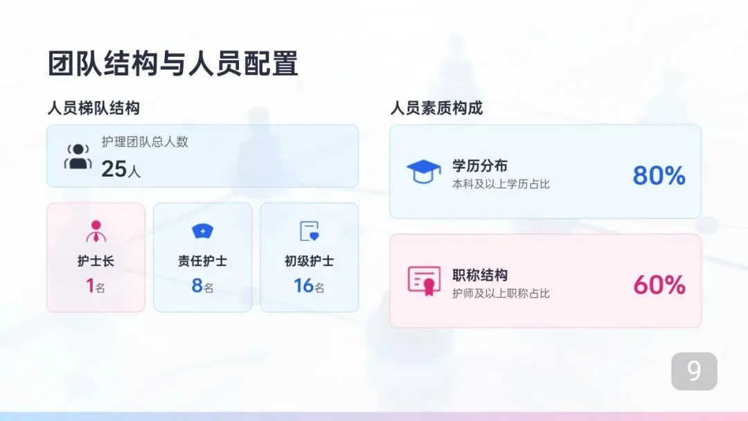 护理团队共25人(1名护士长、8名责任护士、16名初级护士),本科及以上学历占80%,护师及以上职称占60%,梯队结构合理。